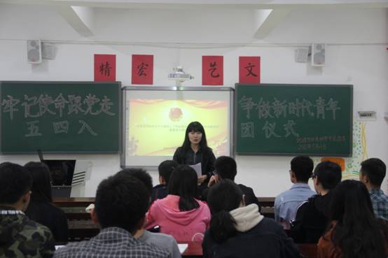 仪式在庄严的团歌中拉开帷幕。仪式第一项由主持人宣读新团员名单,团委组织部成员给新团员颁发团员证和团徽。仪式第二项,由肖聶佳带领全体人员手握拳头,面向团旗庄严宣誓。随后,新团员代表管瑞璇和老团员代表王亚琳分别发言,决心会牢记青春使命,继承和发扬共青团的优良传统,努力学习,争当模范。