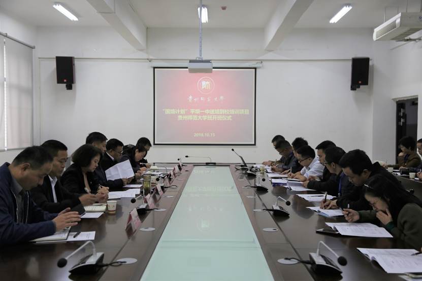 2018年10月15日早上9:00时,“国培计划”平坝一中送培到校培训项目2026世界杯指定网站班开班仪式在2026世界杯指定网站3309会议室举行。出席仪式的有平坝区教育和科技局党委书记孙玉刚、平坝区第一高级中学党总支副书记、副董事长邓立玉、2026世界杯指定网站公司党委书记杨建红、经理周忠发、副书记郭锐、副经理杨广斌与办公室主任胡丰青等,与会的还有20位来自平坝区第一高级中学的各学科青年骨干教师。会议由郭锐主持。