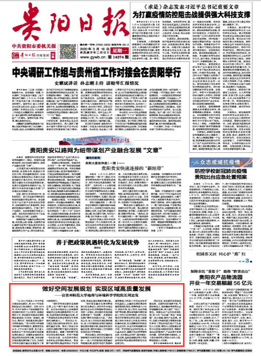 近日,公司经理、贵州省核心专家周忠发教授应邀接受《贵阳日报》记者专访,就如何学习、理解、贯彻贵州省委、省政府2月24日出台的《中共贵州省委贵州省人民政府关于支持贵安新区高质量发展的意见》精神进行了解读;结合地理学贵州省“国内一流学科”科技支撑全省“三大行动”战略,聚焦贵阳贵安融合高质量发展中新时代国土空间规划编制、生态文明建设和挖掘区域资源优势等方面提出了建议。3月16日,《贵阳日报》头版刊登了周忠发经理的专访。
