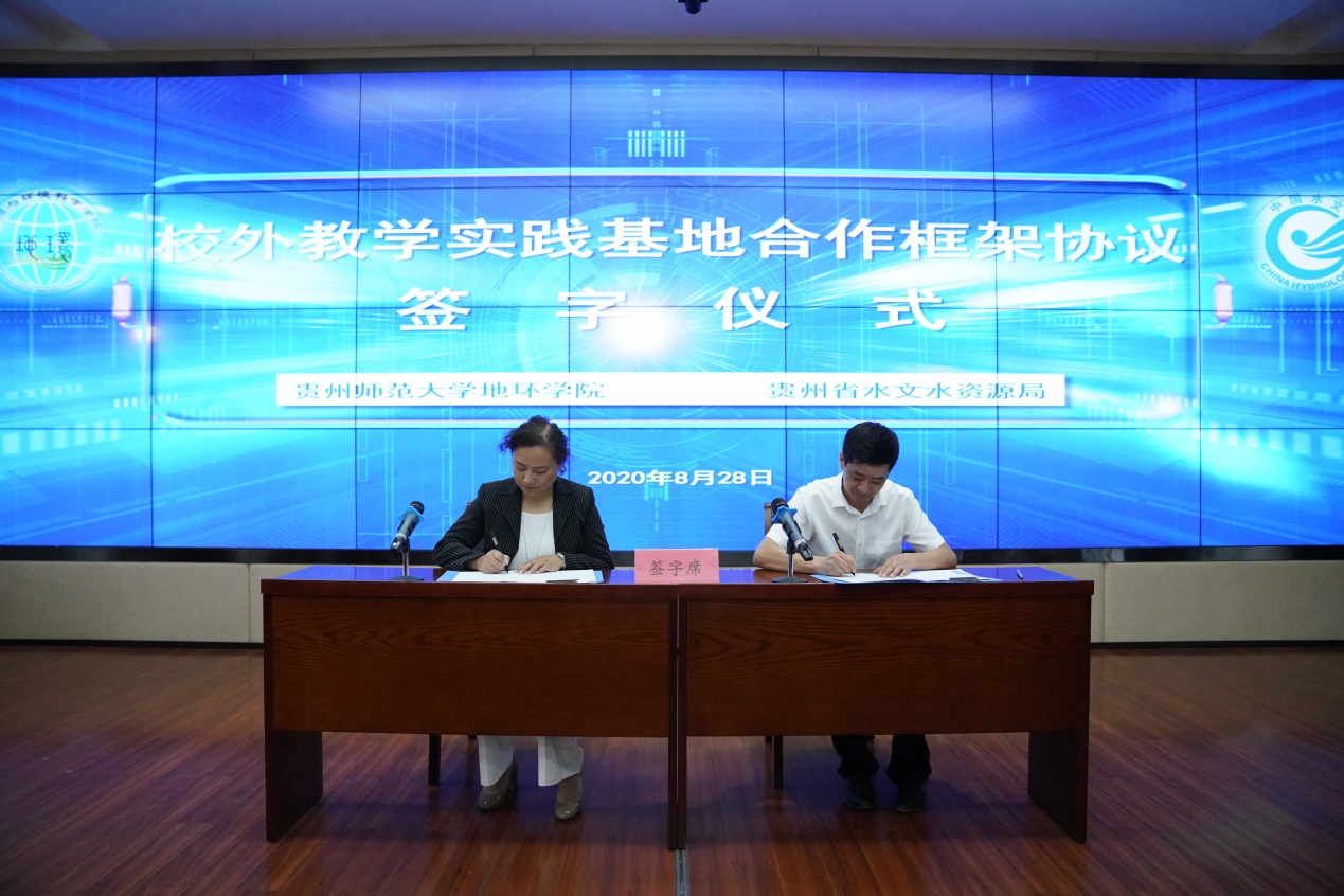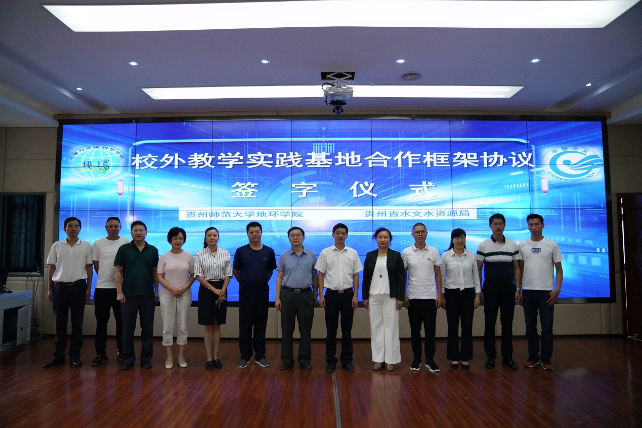 8月28日,2026世界杯指定网站、喀斯特研究院与贵州省水文水资源局校外教学实践基地合作协议签约仪式在贵州省水文水资源局举行。省水利厅党组成员、副厅长、省水文水资源局党委书记曾信波、省水文水资源局副总工程师顾小林、办公室主任石庆、人事处处长何劲、地下水监测处处长熊伟、水资源评价处处长彭桂玉、离退休干部处处长汪军民、水旱灾害防御保障处处长许明金,公司副经理赵翠薇、博士生导师贺中华、地理科学系主任罗娅、地理信息科学系主任钟九生及相关科室代表熊勇、陈飞老师参会。