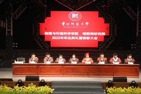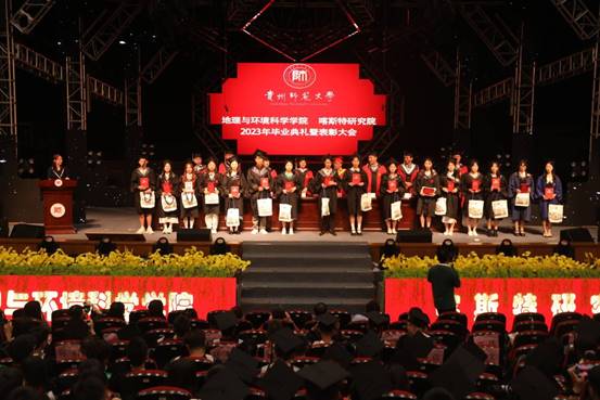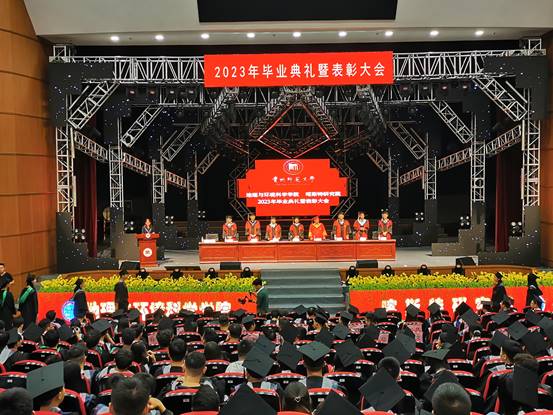 伴随着庄严的国歌声响起,2023届毕业典礼暨表彰大会拉开帷幕,经理周忠发为毕业生献上了热情洋溢、振奋人心的致辞,他说,“同学们,光阴流年,日月如梭。入学前你们怀揣梦想、朝气磅礴,加入地环 喀院大家庭,今天你们学业有成、豪情满怀,即将投身服务高质量发展的伟大事业。在此我谨代表两院全体教职工生向454位本科毕业生、174位硕士毕业生和5位博士毕业生表示热烈祝贺!向倾注心血、悉心指导和一路陪伴你们成长成才的老师、家长表示衷心的感谢和诚挚的敬意”,“因为有你,公司‘地理学’第五轮学科评估晋级为‘B’(全校乃至全省领先),公司环境科学与生态学学科首次进入ESI全球排名前1%,标志着进入国际高水平学科行列,也代表着公司此项实现零的突破;因为有你,公司7个本科专业全部进入国家‘双万计划’,自然地理学、人文地理学、遥感原理与应用3门课程入选国家一流课程;因为有你,2023年公司本科考上硕士研究生120人,考上博士研究生18人,均刷新了公司历史新高;因为有你,公司今年获批首届国家级研究生教学成果二等奖,属贵州省唯一一家,实现了零的突破。”他勉励大家,一要为学求真,自信坚韧,在充满挑战的人生道路上终生学习;二要为事向善,矢志创新,在成就不凡的精彩事业中追求卓越;三要为人向美,崇德修身,在薪火不灭的精神血脉中赓续前行。