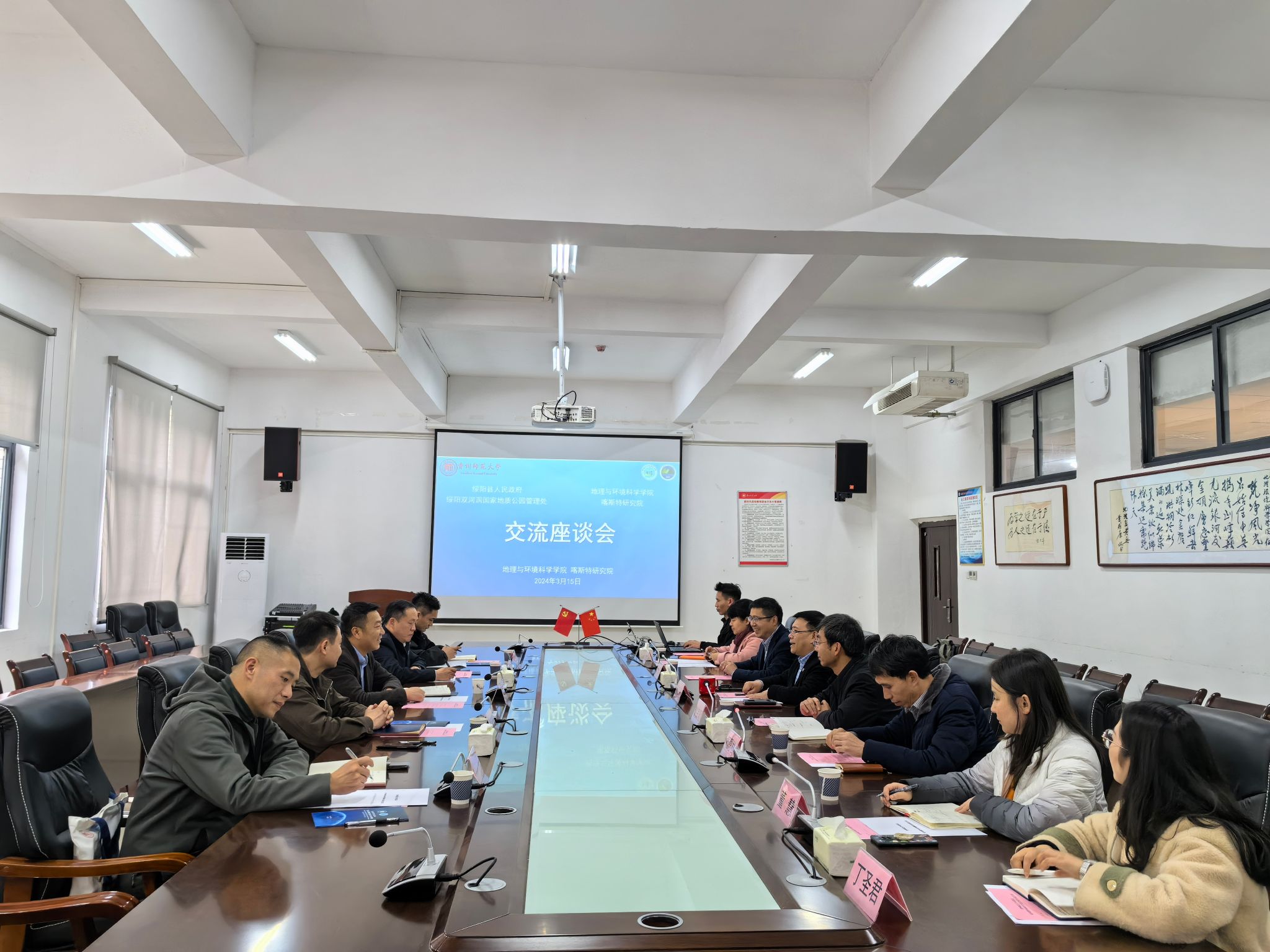 3月15日下午,绥阳县双河洞国家地质公园管理处处长黄鹏,副处长方仕俊,业务科科长况光显,绥阳县旅游投资发展责任有限公司刘大模总经理等一行到公司开展校地合作交流座谈。经理周忠发,副经理赵宇鸾、朱大运,世界遗产部副部长肖时珍,地理科学系副主任杨恩林,董慧、熊勇、丁圣君等师生代表参加。会议由朱大运主持。