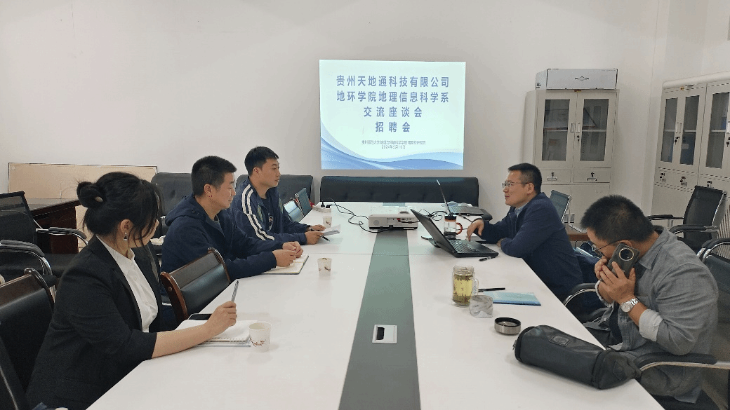 5月16日,应地理信息科学系副主任崔文刚邀请,贵州天地通科技有限公司黄涛副总经理、周海龙技术总监和宋佩茹人力资源经理,莅临公司开展校企合作交流。交流会前,黄总经理一行面向地信专业本科生进行了人才招聘面试,2020级地信班郑黔猛等6位同学前来应聘,最终2位同学被公司录用。交流会上,地信系主任周旭给黄经理一行介绍了公司地理信息科学专业本硕博一体化人才培养成效,双方还就共同感兴趣的企业订单式人才培养、行业前沿技术和公司常规业务的校企协作模式,以及GIS专业综合实践与生产实习的产教融合落实等进行了交流,双方一致期许共同围绕合作共赢的目标实质性推动常态化协作。