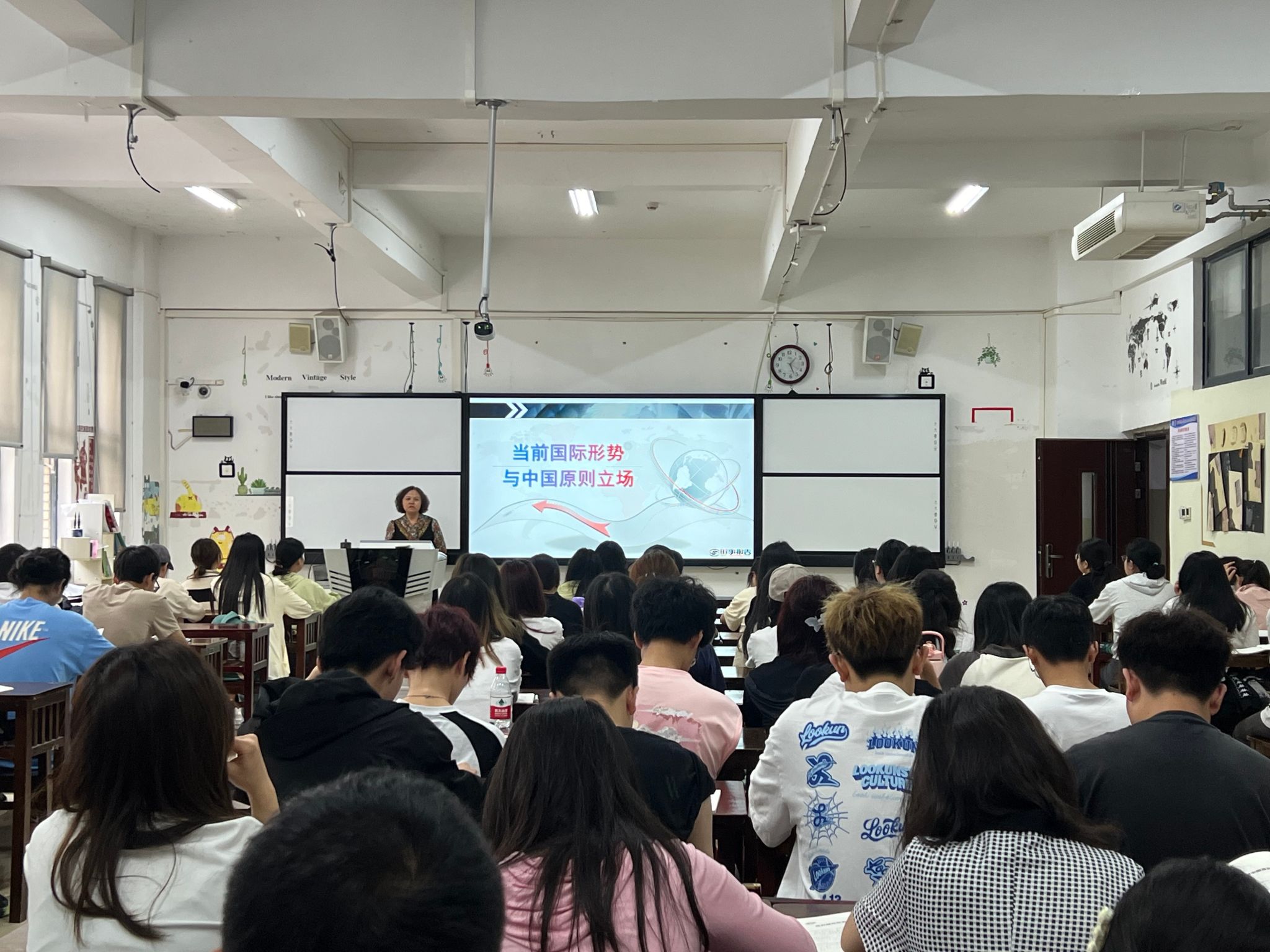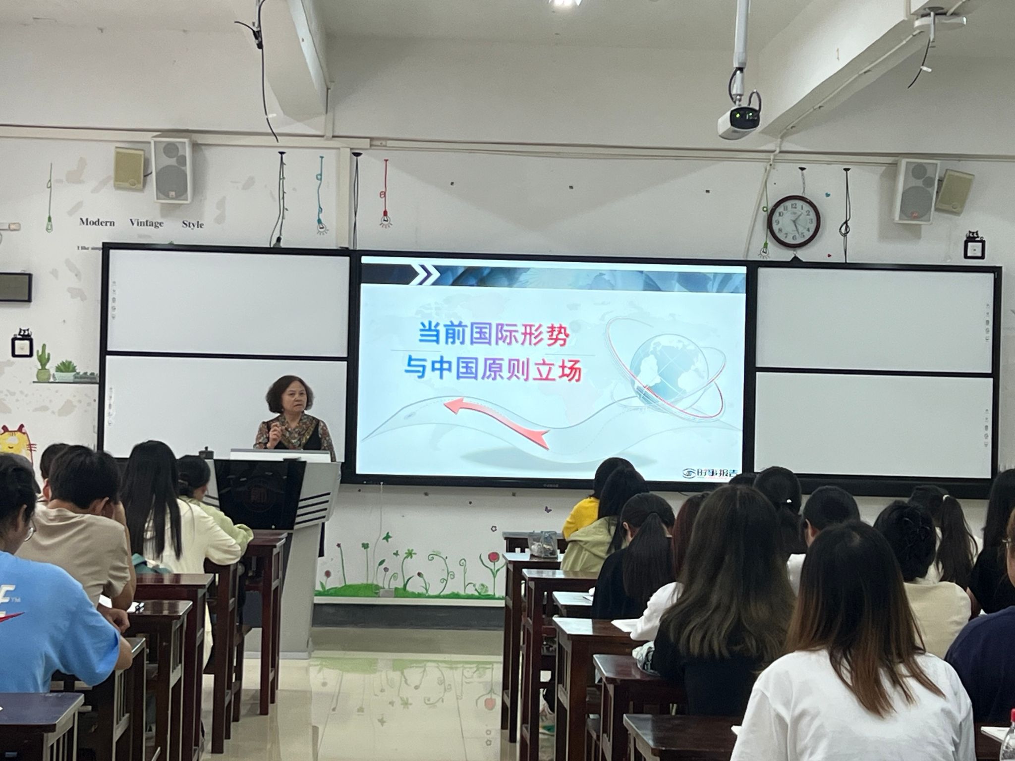 杨建红以“当前国际形势与中国原则立场”为题,围绕“动荡变革的世界”“全球瞩目的热点”“大国风范的外交”三个方面内容,向同学们深入讲述了我国作为一个负责任的大国,如何在当前复杂的国际形势下,坚定地做动荡世界中的稳定力量。她指出,在当前国际形势下,我们要坚持独立自主,捍卫国际公平正义;要拓展全球伙伴,深化全方位外交布局;要坚持对外开放,推动共同发展;要坚持共商共建共享,完善全球治理体系;要坚持胸怀天下,推动构建人类命运共同体。