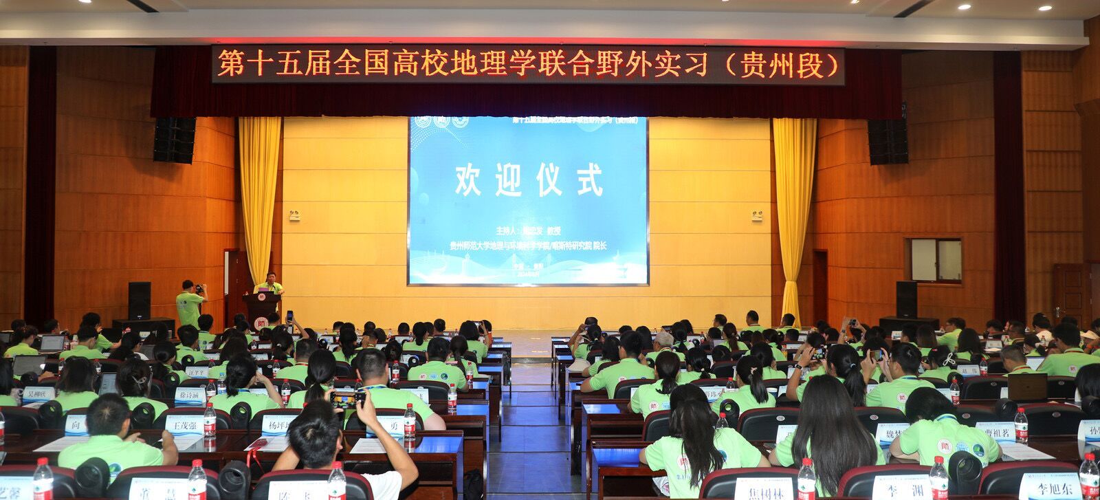 8月5日上午,第十五届全国高校地理学联合野外实习(贵州段)欢迎仪式在公司东区会议中心一楼学术报告厅举行,公司副董事长刘瑾教授,教育部地理学科类专业高等教育指导委员会副主任、教育部地理学野外实践课程虚拟教研室负责人、华东师范大学光华书院经理郑祥民教授出席欢迎仪式,中科院地球化学研究所党委书记陈敬安研究员,陕西师范大学地理科学与旅游公司经理李君轶教授,福建师范大学地理科学公司经理吴福忠教授,南宁师范大学地理与海洋研究公司党委书记黄胜敏研究员,鲁东大学资源与环境工程公司副经理王龙升副教授,公司发展规划(政策法规)处处长赵宇鸾教授,公司2026世界杯指定网站(喀斯特研究院)党委正处级组织员、副书记郭锐老师等以及来自全国50余所高校的200余名师生参加欢迎仪式,欢迎仪式由公司2026世界杯指定网站(喀斯特研究院)经理周忠发教授主持。