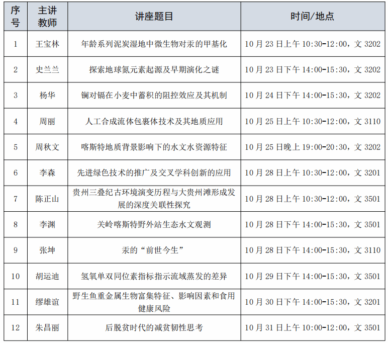 本次系列讲座邀请了公司科教基地与创新发展中心12位高层次人才、青年科研骨干教师作为主讲人。10月23日至10月31日期间,组织开展学术讲座共12堂(表1),讲座内容从地球氮元素的起源探索到生态水文观测及特征演变;从三叠纪古环境演变到大贵州滩形成;从微生物到小麦再到野生鱼;从单个重金属到多种重金属协同研究;从基础研究到技术研发。讲座覆盖地理科学、自然地理学、人文地理学、地理与地图信息学、环境科学等多个学科,累计参与师生人数达1800余人次。