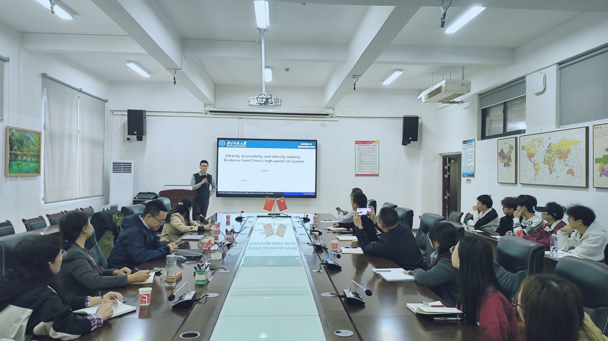 郑龙飞博士作了题为“Intracity accessibility and intercity mobility: Evidence from China’s high-speed rail system”的学术报告。郑博士以“偏远高铁站的关闭现象”为切入点,探讨“城市内可达性是否影响高铁出行?”“如何预测城际高铁客流?”“哪些因素导致高铁站客流不足?”等问题,引导师生思考“何为高铁站可达性的地理学研究”。通过分析2014至2016年间32亿条高铁票务数据,郑博士构建了城市内高铁站可达性指标与城际出行潜力模型,系统展示了“找要素(如站点位置、交通方式)、看关系(如可达性与客流的关系)、做评价(如站点分类与政策建议)”的跨学科研究路径。研究不仅揭示了城市内可达性对高铁客流的显著影响,还识别出三类高铁站类型,并提出差异化的规划与运营策略,为高铁站点优化与区域交通一体化提供了科学依据。