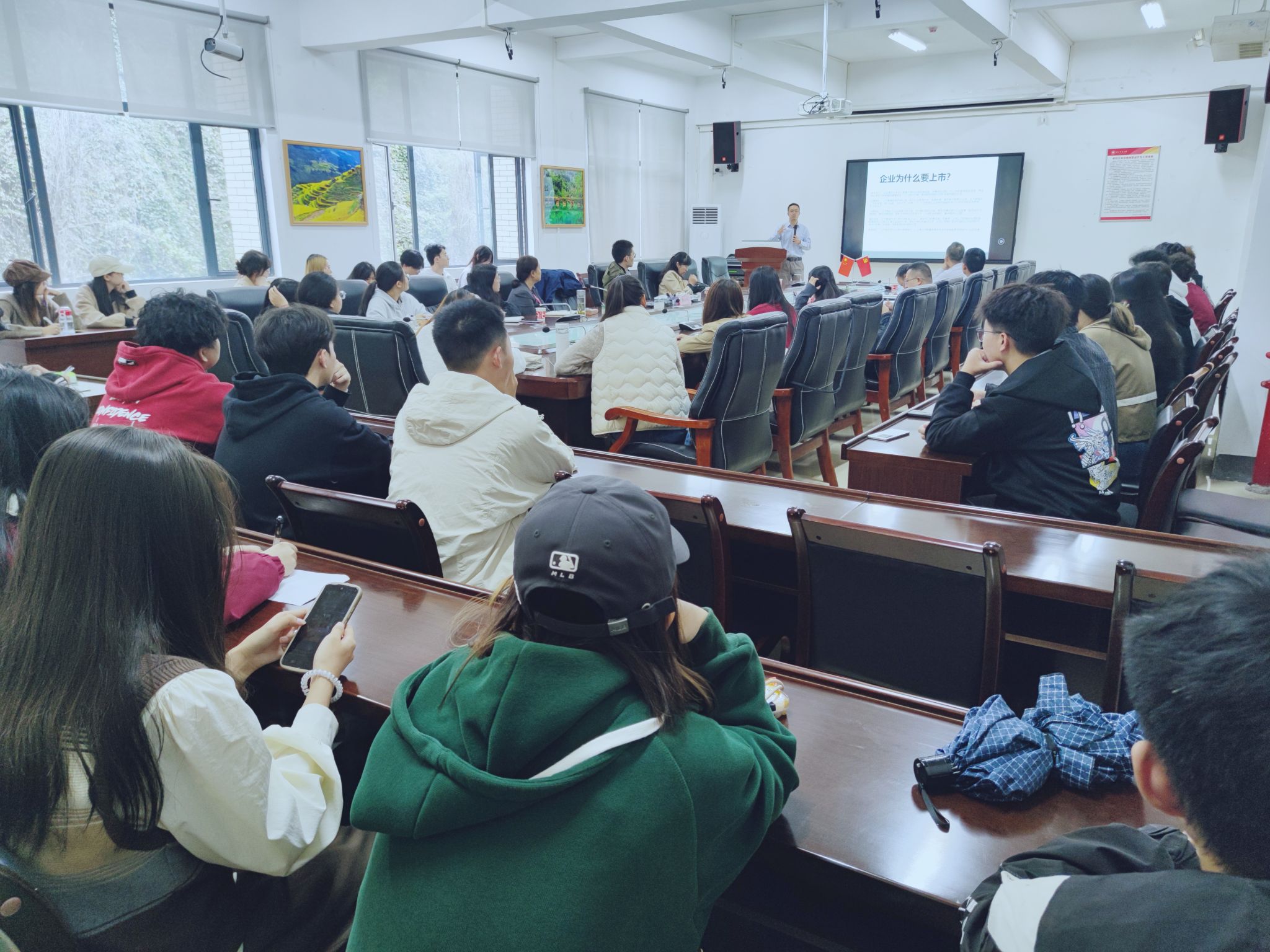 潘峰华教授作了题为“上市企业地理学”的学术报告。潘教授以“中国企业为何选择在特定城市设立总部或赴海外上市”为切入点,从融资、治理、激励和发展等多维度解读企业上市动因,并深入探讨了上市企业空间分布背后的地理逻辑。通过“上市企业(总部)在哪里?”“哪些城市上市企业市值与该城市经济规模比值更高?”“中国企业去境外哪里上市?有怎样的动态变化?”等关键问题,引导师生思考“何为地理学视角下的企业研究”。报告结合中国城市证券化率(CSR)的时空格局与影响因素分析,展示了空间分布、制度背景、集聚经济等之间的内在逻辑联系,揭示资本市场与城市发展之间的复杂联系,体现了跨学科融合在理解经济地理现象中的重要作用。