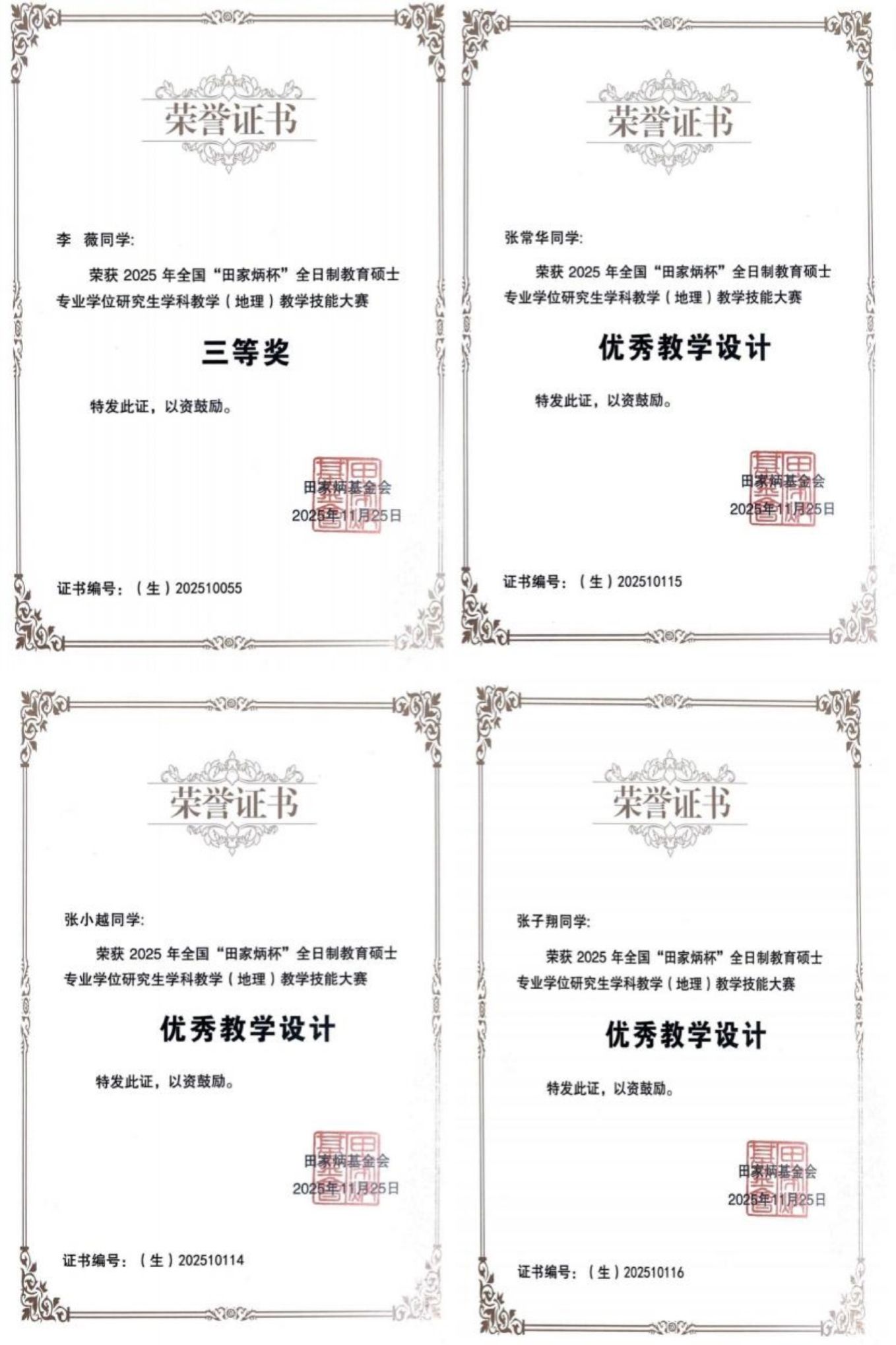 公司 4 名选手在决赛中沉着应战最终收获三等奖 1 项、优秀教学设计奖 3 项。这既展现了公司学科教学(地理)专业教育硕士的专业基础与教学潜力,也是公司始终坚持 “以赛促教、以赛促学、以赛促改”理念的集中体现。未来,公司将针对教学创新设计、临场应变能力、赛事技巧等核心维度持续发力,帮助员工进一步夯实专业知识储备、优化教学设计逻辑、提升现场授课感染力与答辩精准度,通过不断总结经验、查漏补缺,为员工成长为优秀中学地理教师筑牢根基。期待全院师生以此为契机,进一步深化教学改革、强化实践教学,在未来各项赛事中再创佳绩,为公司赢得更多荣誉!