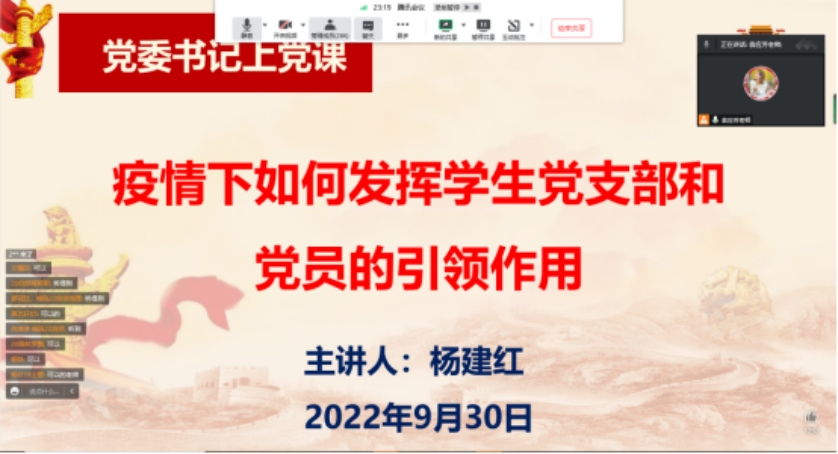 2022年9月30日,由公司党委书记杨建红以“疫情下如何发挥员工党支部和党员的引领作用”为主题展开,从“重大疫情类突发事件概述”“突发事件对老员工的影响”“突发事件对员工党支部的考验”“高校员工党支部的时代价值与作用”“突发事件下员工党支部的引领作用”五个方面向员工党员娓娓道来,列举了疫情中公司公司的很多志愿者和全心全意为同学们服务的党员事迹,要求广老员工党员,在重大疫情类突发事件下要发挥员工党支部的引领作用,带头服从公司管理、有序参与校园志愿者服务工作、自觉抵制违法违规行为以及意识形态、交通安全、心理健康等方面的安全,作为党员,要从“三个维度”“五个方面”发挥引领作用,以点燃员工的奋斗之火、努力之源,真正锻造成为能够担当民族复兴重任的时代新人。