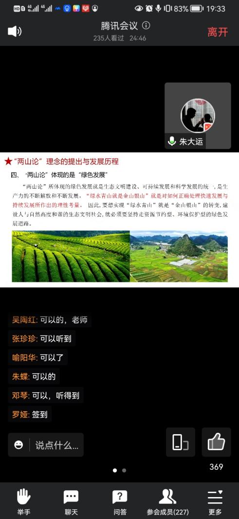 2022年11月22日,由副经理朱大运老师以“守护绿水青山,科技服务生态文明建设”为主题展开。朱大运老师从党的二十大中“绿水青山就是金山银山”即“两山论”讲起,到贵州省的生态方面的政策解读,再到良好的生态环境与民生福祉的关系等方面着眼,讲述极多破坏生态环境的案例,并以黄土高原生态修复奇迹、内蒙古库布齐沙漠的沙漠变绿洲奇迹、贵州石漠化治理创造的花江模式、易地扶贫搬迁等讲述以破坏生态环境为代价的发展到科技服务生态文明建设的过程。朱老师运动习近平生态文明思想出发,很好地分析清楚了绿水青山与金山银山之间的关系。
