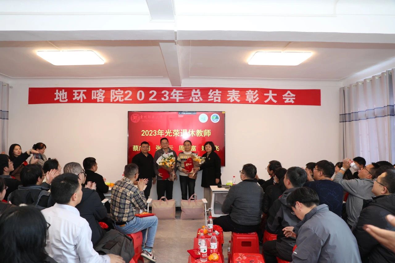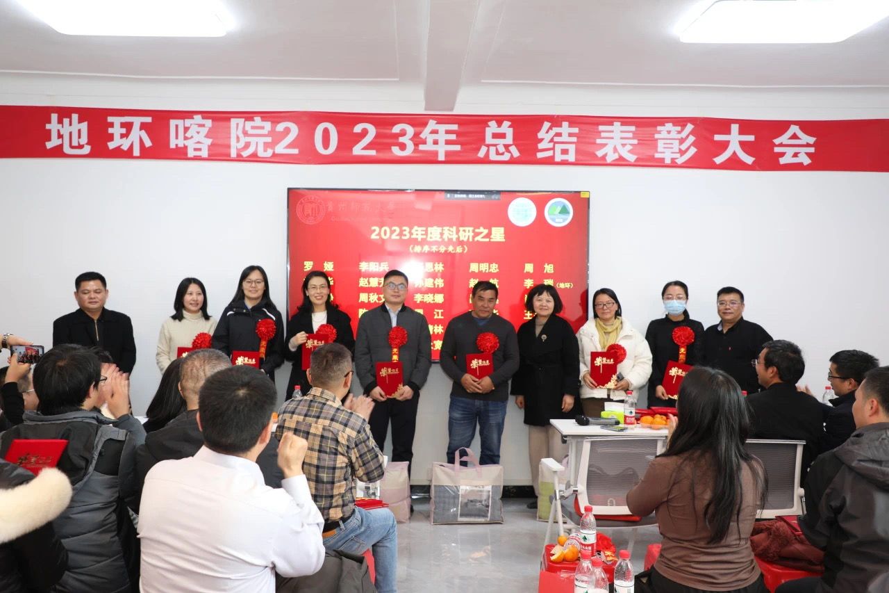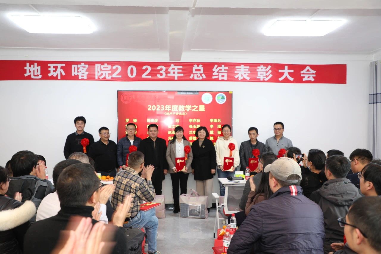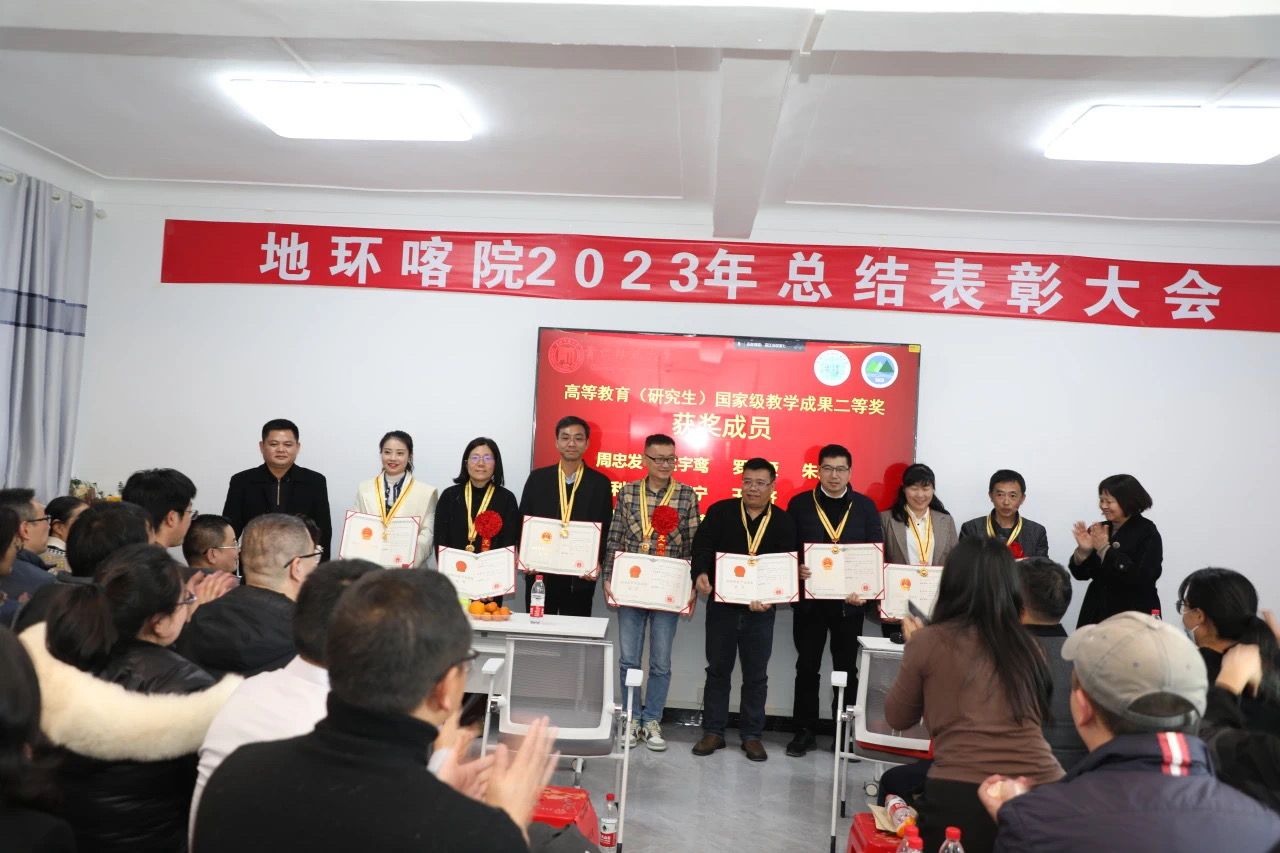 公司党委书记杨建红为公司获全国高等教育(研究生)国家级教学成果二等奖、由周忠发教授领衔的《赓续黄大年精神,立足为学为事为人,创新地理学多层次人才培养体系与实践》项目获奖成员颁奖;赵宇鸾副经理宣读2023年度优秀共产党员、优秀党务工作者表彰文件;朱大运副经理宣读2023年度先进个人(教学之星、科研之星、服务之星)表彰文件,公司党政班子成员为获得以上荣誉的教职工颁奖。