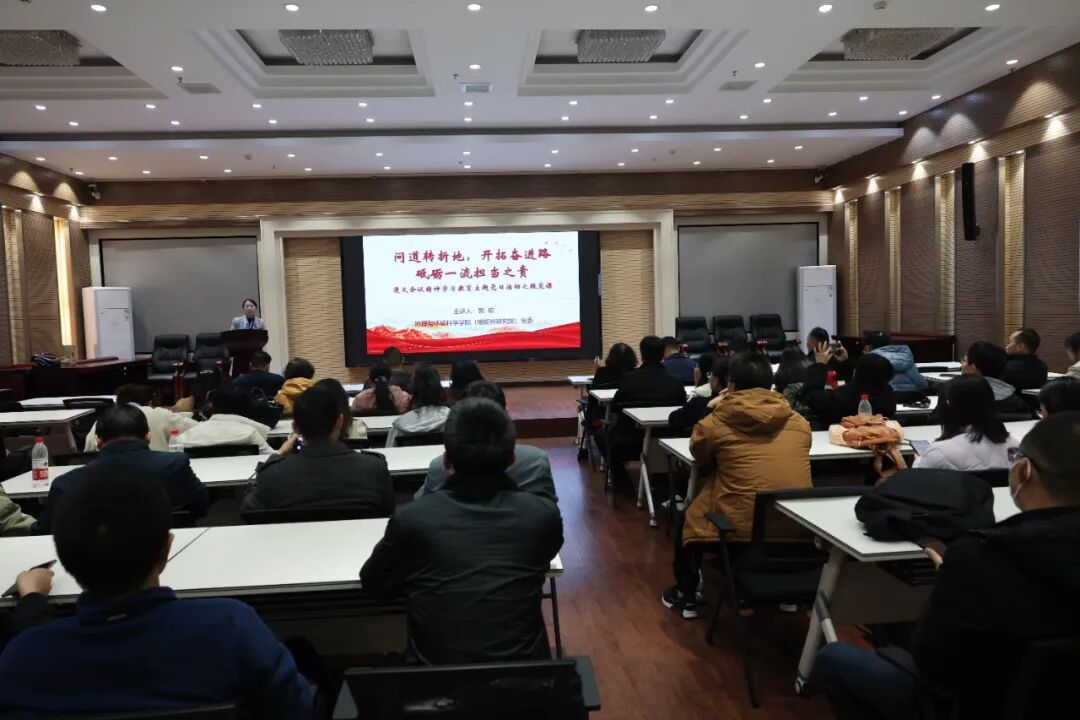 公司党委书记郭锐以“问道转折地,开拓奋进路,砥砺一流担当之责”为题为大家上了一堂声情并茂的现场微党课。她从“遵义会议:历史的回响与时代的叩问”、“问道转折地:遵义会议的精神内核与时代启示”、“开拓奋进路:将遵义会议精神融入公司公司发展实践”、“砥砺担当之责:党员教师应有的姿态与作为”四个方面,结合公司发展实际,号召同志们弘扬伟大长征精神和遵义会议精神,立足本职干好工作,在坚定理想信念上担当表率、在潜心教书育人上担当表率、在勇攀科学高峰上担当表率、在服务社会发展上担当表率、在恪守学术规范上担当表率,做新时代“四有”好老师。她强调,同志们要将遵义会议精神融入公司公司发展实践,坚守育人初心,服务国家战略,助推区域发展。要聚力一流建设,勇闯发展“创新路”,聚合师生力量,画好团结“同心圆”,形成推动公司发展的强大合力,奋力开拓公司事业发展的奋进之路,为实现公司“教师教育优势突出的区域高水平大学”的目标,为教育强国、科技强国、人才强国建设贡献我们应有之力。