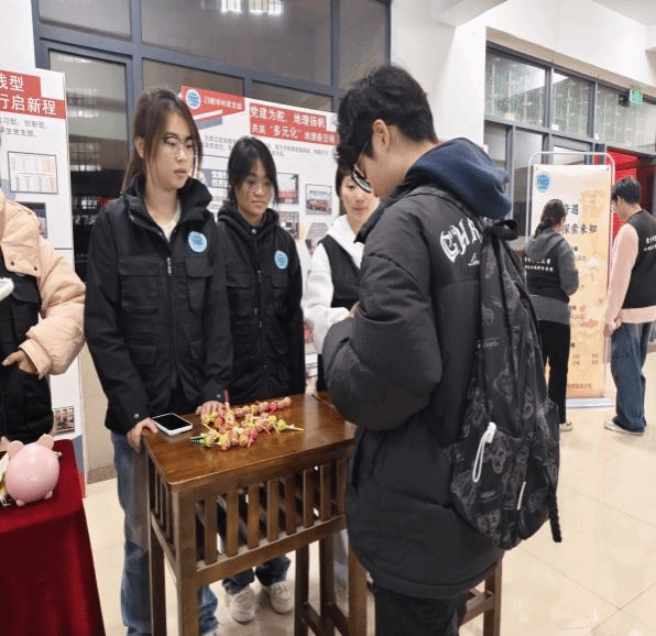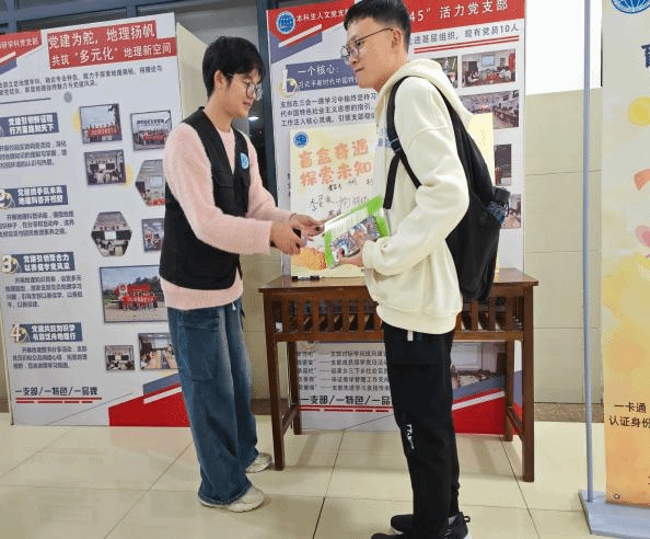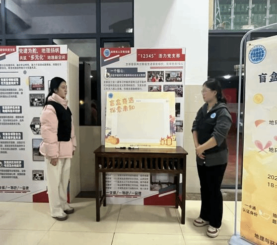 本次活动设置了地理知识问答与盲盒抽奖环节,盲盒奖品来源于全院高年级员工的爱心捐赠,共设置盲盒奖品81份,参与奖品50份,该环节吸引了众多同学踊跃参与。活动中,同学们首先按照流程向志愿者展示一卡通验证身份,以此获得答题资格。随后,志愿者向参与者提出事先准备的地理知识问题,参与者回答正确即可获得抽签机会并能抽取盲盒奖品,反之则直接可以领取参与奖品。组织本次活动的11名志愿者耐心提问,参与者积极回答,一问一答、互动自如,现场充满了竞答的互动声与抽到奖品的欢呼声,热烈非凡。同学们抽取礼物结束后在志愿者的引领下到达签名处签下自己的名字,记录这次美好的回忆。