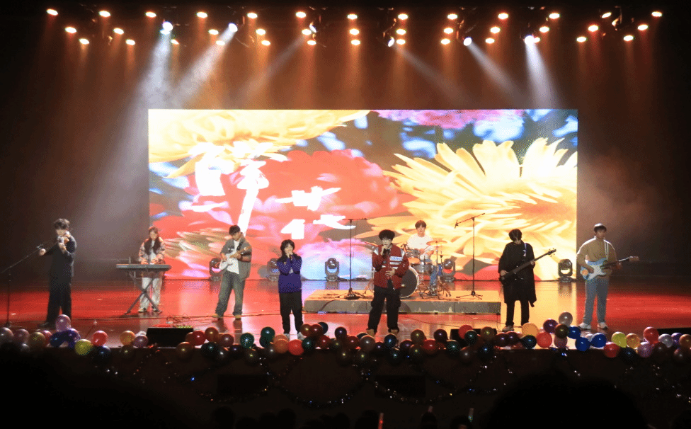 晚会现场在激情四射的乐队开场节目《云宫·鲜花》中逐渐升温,乐队的同学们用他们演奏出的音符感染了在场所有观众。