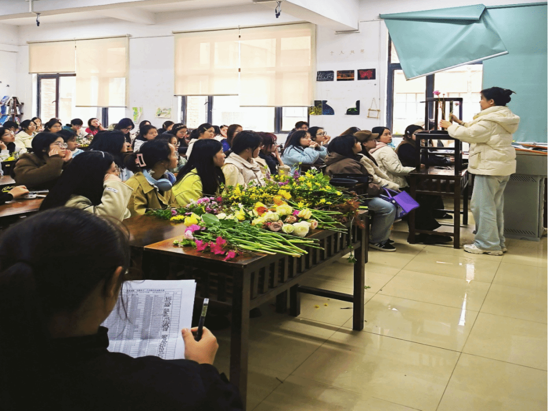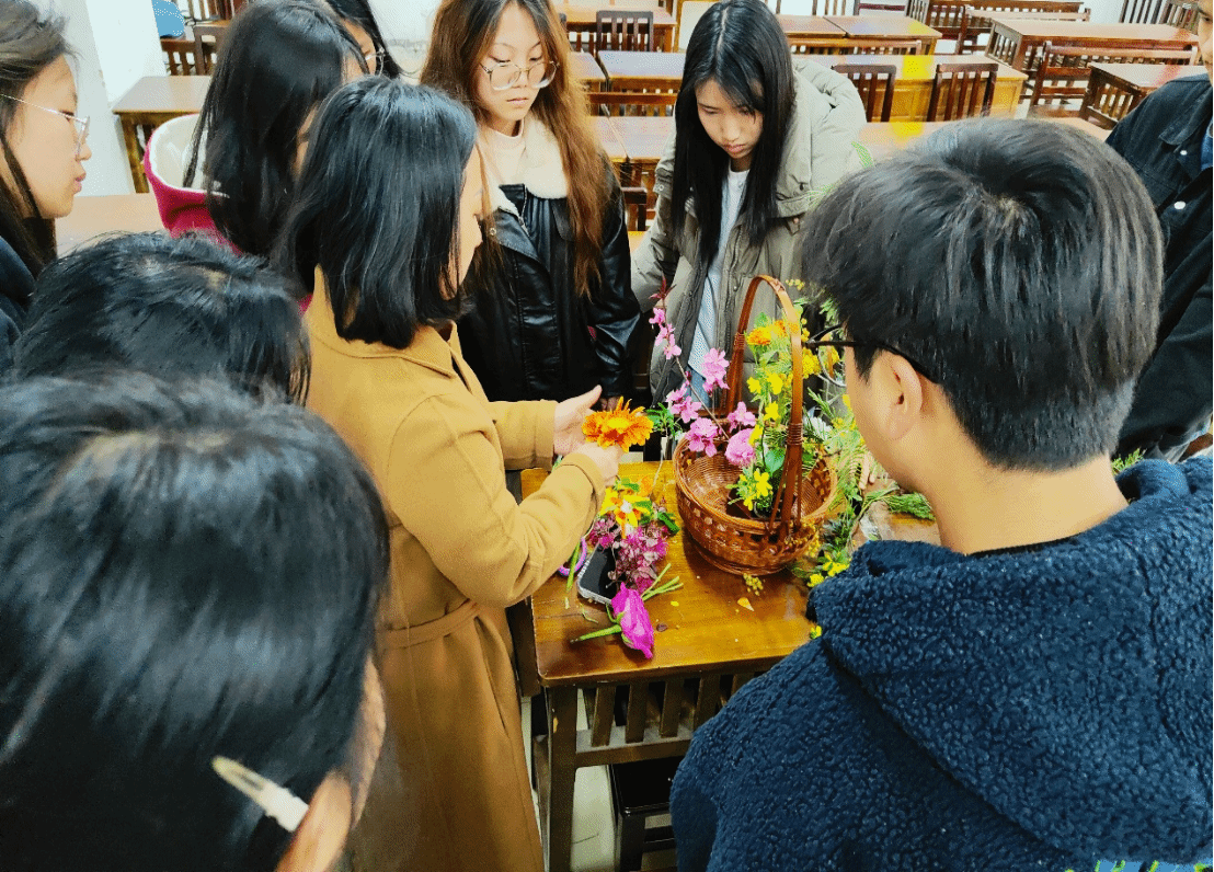 随着活动的正式开始,在园林系黄苏燕老师的指导下,美植花社社长罗贤庆为大家带来了精彩的中式插花文化讲解。她不仅介绍了中式插花的历史渊源和艺术特点,还为大家演示了中式直立式盘花的插花技巧,并引导大家进行赏析。在她的讲解下,参与者们对中式插花有了更加深入的了解和认识。