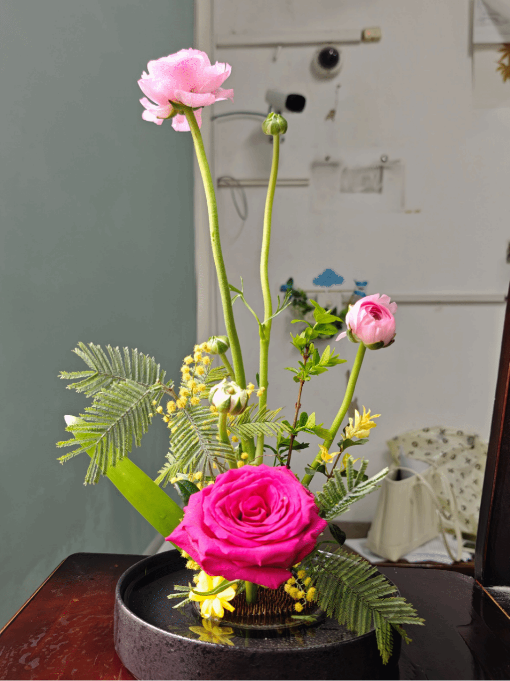紧接着是大家最为期待的插花体验环节。在讲解结束后,参与者们纷纷动手尝试,根据自己的喜好选择花材,并进行创作。整个教室充满了欢声笑语和花香四溢的氛围。