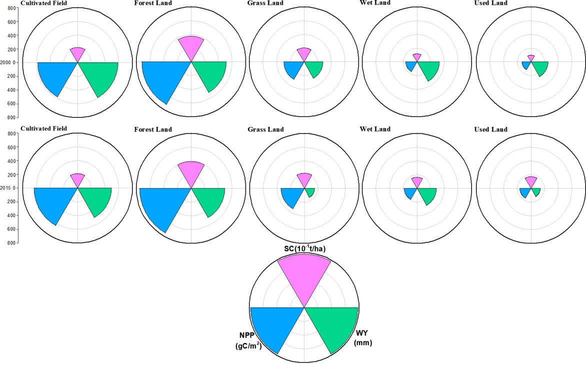 图5 研究区2000-2015年不同土地利用类型生态系统服务玫瑰图