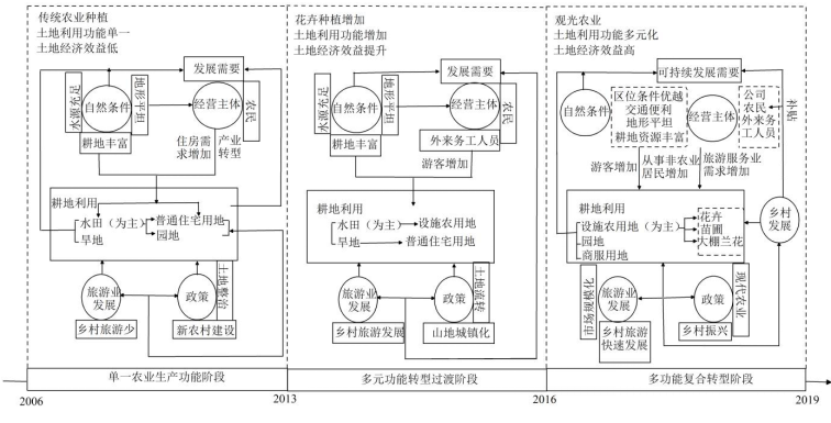 研究发现:①好花红村土地利用功能受土地利用形态的影响,由传统单一的农业生产功能、社会保障功能和生态保育功能转变为复合型观光休闲功能和经济发展功能,增加了经济效益同时保证了生态效益,土地利用功能总体上呈现出多元化和复合化特征。②研究区不同演变阶段的演变模式存在显著差异,经历了单一农业生产功能阶段、多元功能转型过渡阶段、多功能复合转型阶段,土地利用功能演变有以农为主,乡村旅游为辅、农旅结合,农业逐步退缩、以乡村旅游为主,整体转型3种模式。③自然条件是土地利用功能变化的基础,经营主体变化是土地利用功能转型的内在动力,区域发展政策是驱动土地利用功能多元化的根本动力,旅游市场“规模化”需求是驱动乡村功能和土地利用功能转化的重要推动力,这些因素相互作用,共同驱动土地利用功能演变。