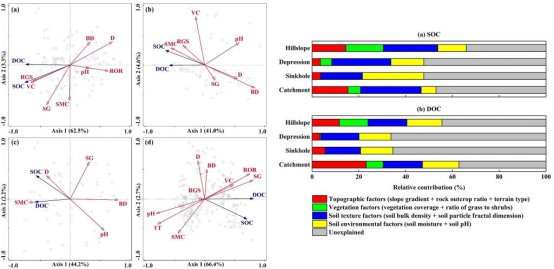 明确喀斯特地区土壤有机碳(SOC)分布格局与控制因素对土壤碳管理具有重要意义。然而,由于人类活动与生境异质性差异,以往关于该地区SOC影响因素的研究结论并不一致。本研究选择了中国南方喀斯特地区典型自然恢复小流域,分析了流域内坡地、洼地与落水洞三种地形下的土壤性质与有机碳储量的分布与变化情况,通过冗余分析与多元线性回归模型确定了不同地形中SOC的影响因素。结果表明,地形和水文条件影响坡地SOC分布,坡地SOC和溶解性有机碳(DOC)的空间异质性较大。洼地因农业活动造成有机碳损失严重,而坡地因自然恢复时间相对长,SOC积累更明显。此外,环境因素对SOC、DOC变化的影响因不同地形类型而异;其中,土壤质地因子是控制小流域尺度SOC变化的主控因子。