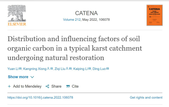 近日,李渊博士在生态恢复领域1区TOP期刊《Catena》发表题为“Distribution and influencing factors of soil organic carbon in a typical karst catchment undergoing natural restoration”研究论文。