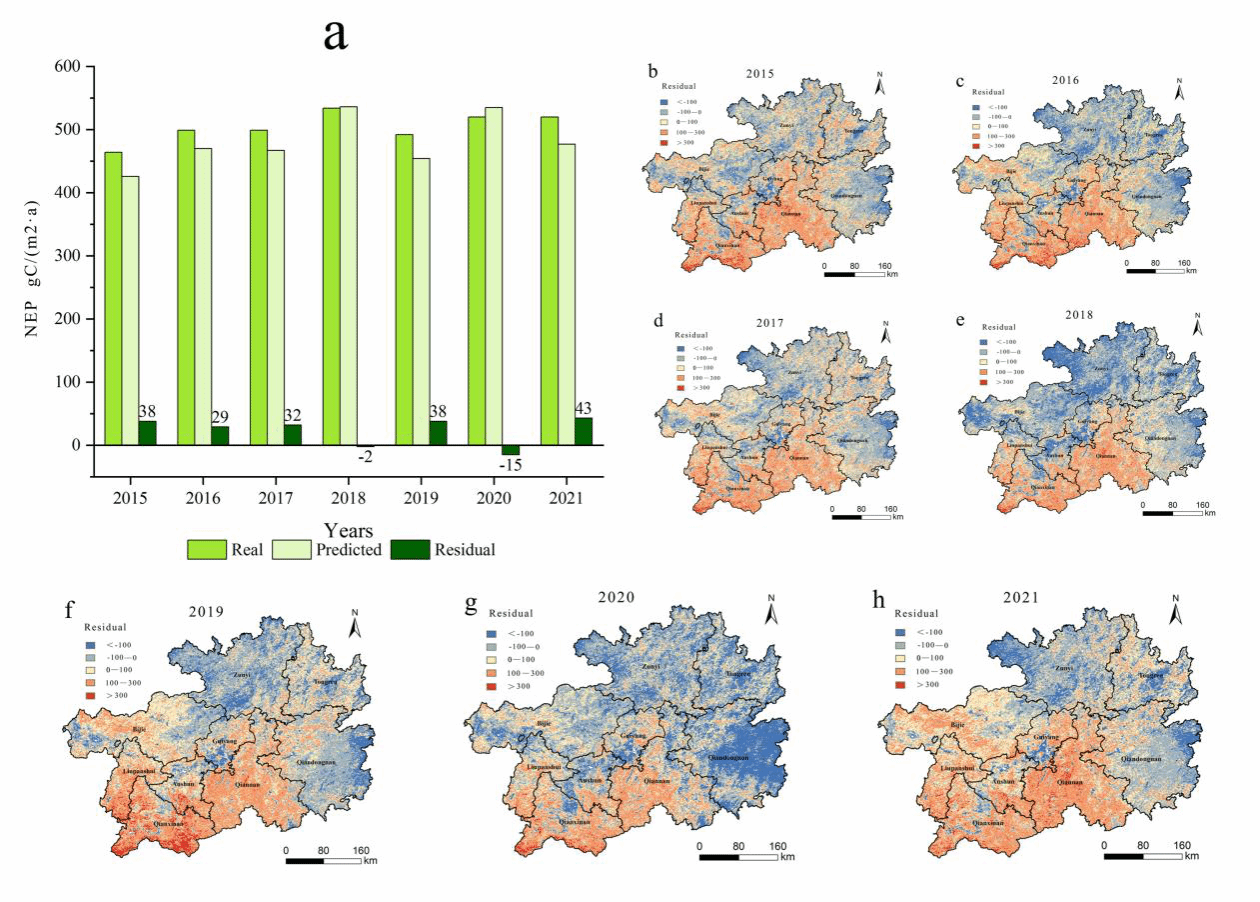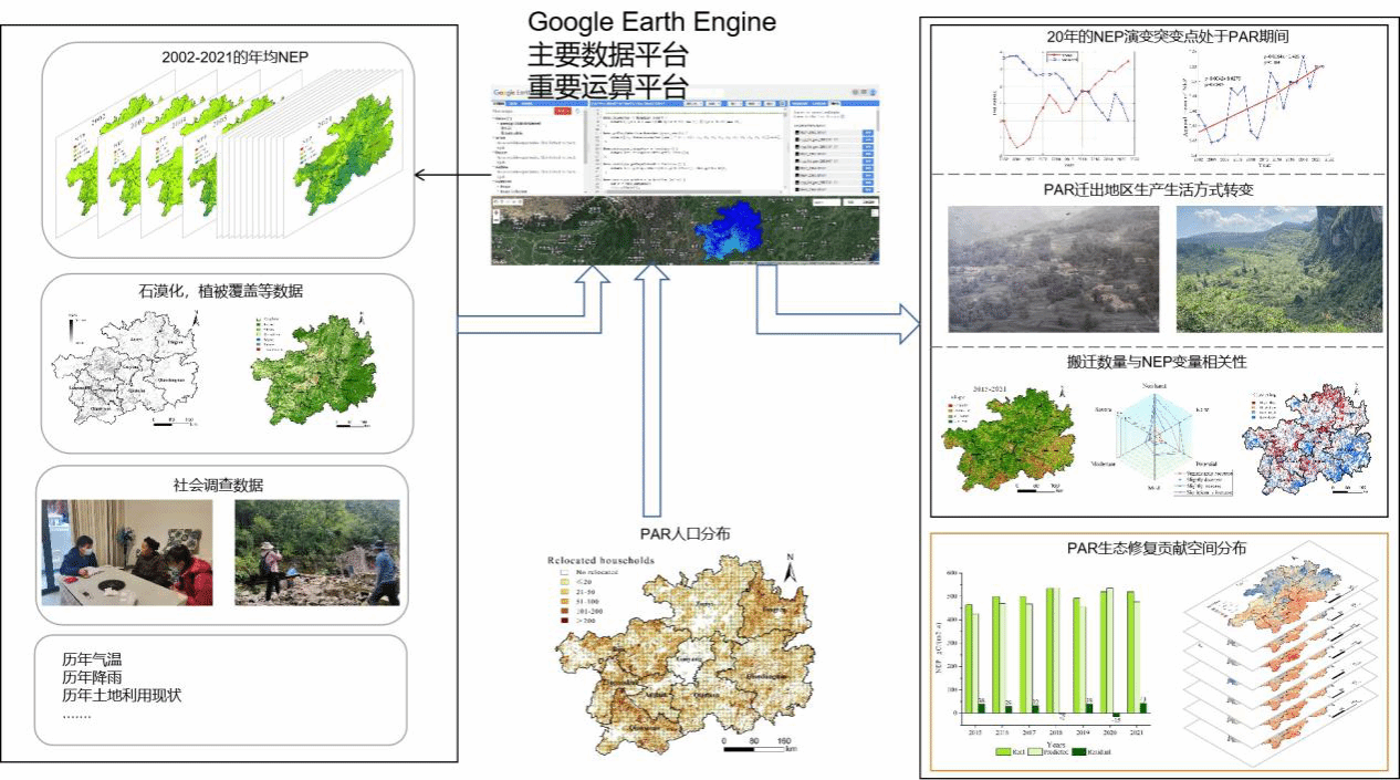 该项研究以Google Earth Engine(GEE)作为运行平台,以净生态系统生产力(NEP)为分析指标,评估了研究区近20年的NEP演变趋势,基于多元线性回归模型区分易地扶贫搬迁和其他因素对碳汇的影响,从而量化易地扶贫搬迁对碳汇能力变化的影响程度。研究得出结论,2002-2021年期间贵州省NEP均值呈波动递增趋势,岭回归平均趋势系数为0.0046,碳循环以碳汇占绝对主导。2015-2021年研究区岭回归平均趋势系数为0.0066,易地扶贫搬迁促进NEP提升区域主要集中在西部等生态脆弱区域。2015-2021年,易地扶贫搬迁对NEP提升贡献程度为4.62%,大约每年净吸收405.26×104t的CO2。