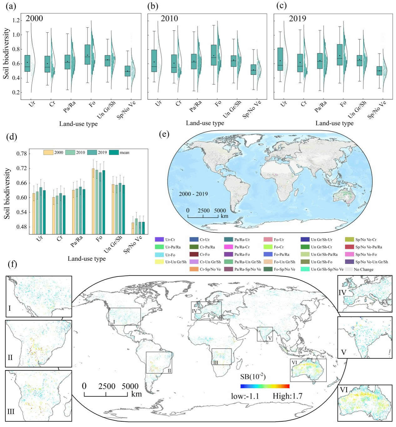 Fig 5. 土壤生物多样性在每类土地利用中的分布与变化。(a),(b),(c)表示2000,2010,2019年土壤微生物多样性的箱线图和正态曲线,横线代表中值线,黑点代表平均值,虚线表示异常值,系数为1.5。(d)土壤生物多样性2000, 2010, 2019以及2000-2019年的年平均值。(e)2000-2019年土地利用变化。(f)2000-2019年变化的土地利用变化中土壤生物多样性的变化情况。