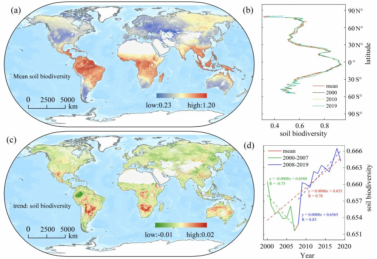 成果简介:土壤生物多样性(soil biodiversity, SB)是维持陆地生态系统功能的关键因素之一,但其时空变化及其驱动力尚不清楚。虽然已有学者对SB的变化做了一定的研究,但大部分都集中在实验或者小区域的研究上,较少有关于全球的研究,关于气候和土地利用变化对SB的影响的信息更是缺乏。这是由于缺乏全球尺度像元上的SB数据,而这种模拟数据对于气候和土地利用变化对SB的影响是必要的。因此,为了评估SB对各种因子的敏感性,我们使用了6种全球环境层因子生成了2000-2019年期间全球SB的数据集,分析了全球和区域SB的空间分布及变化率,测试了长时间序列的气候和土地利用变化对SB动态影响。