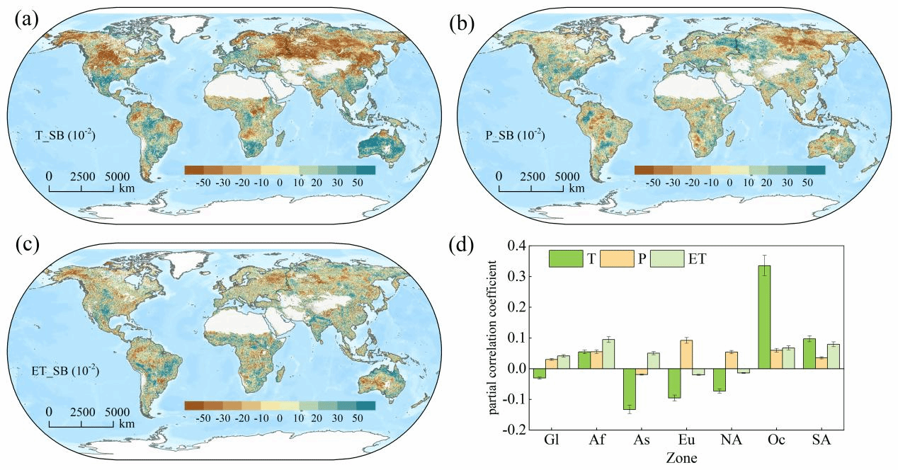 Fig 3. 土壤生物多样性与气候因子之间的二阶偏相关系数的空间分布;(a), (b), (c)分别表示T、P、ET与土壤生物多样性的偏相关; (d) 6个大洲的土壤生物多样性与3个驱动因子的偏相关系数,驱动因子分别为年平均温度(T)、降水(P)、蒸散发(ET),虚线表示10%的误差。Gl、Af、As、Eu、NA、Oc、SA代表全球、非洲、亚洲、欧洲、北美洲、大洋洲、南美洲。
