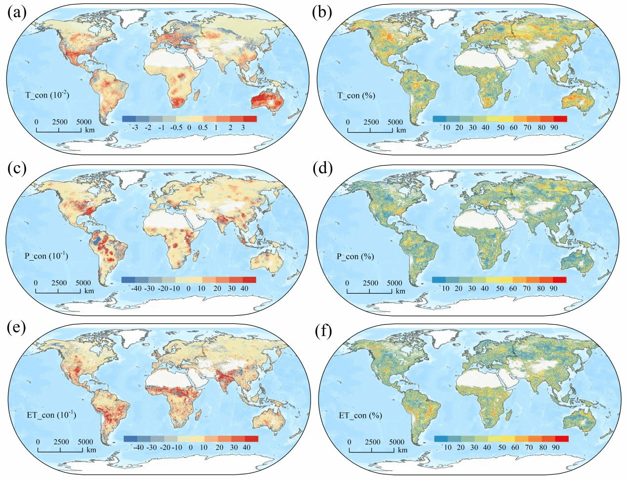 Fig 4. 各因子对土壤生物多样性的贡献值和贡献率。(a),(c),(e)分别表示温度、降水、蒸散发对土壤生物多样性的贡献值;(b)(d)(f)分别表示温度、降水、蒸散发对土壤生物多样性的贡献率。