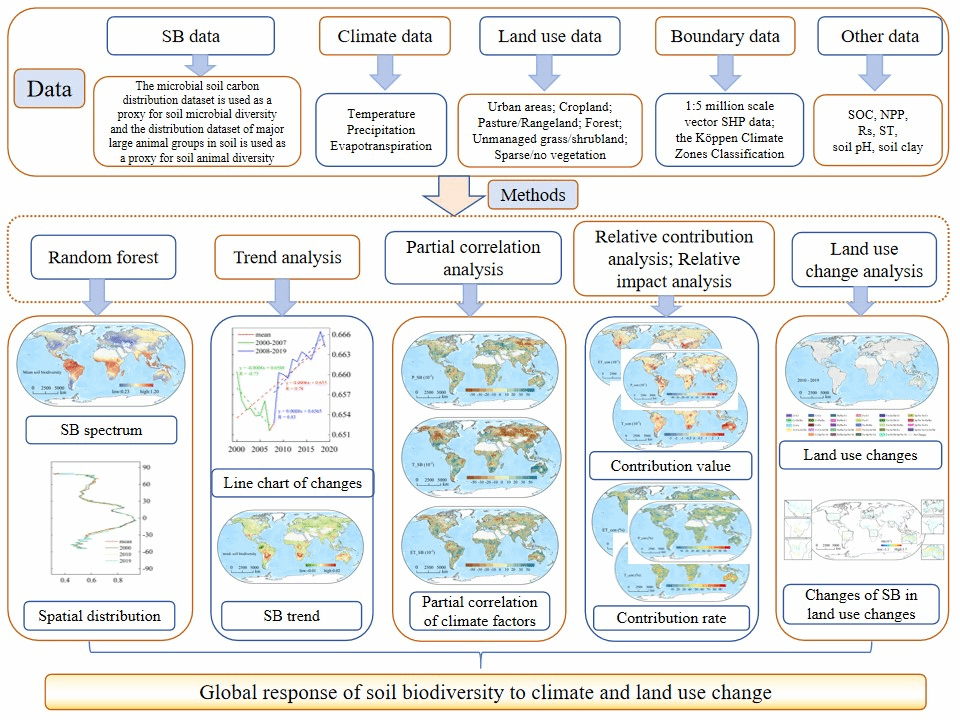 图1. 本文的工作流程图。SB:土壤生物多样性;SOC:土壤有机碳;NPP:净初级生产;Rs:土壤呼吸;ST:土壤温度。