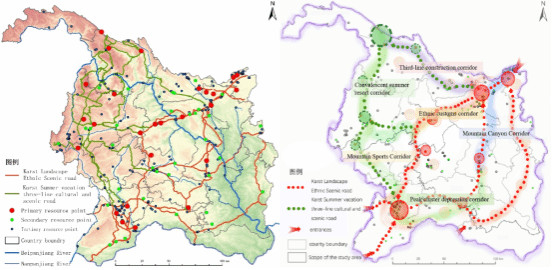 研究背景:喀斯特地区蕴藏着丰富地质遗迹、地貌景观等资源,但也面临着石漠化、地质灾害频发等生态环境问题,因此,探索喀斯特地区生态保护与经济社会协调发展的路径是关系喀斯特地区景观资源合理利用与可持续发展的重要议题。风景道多由跨越行政边界的交通廊道构建而成,将自然景观、人文景观等资源串联起来,形成一个复合型旅游-社会-生态系统。其跨越了省、县等不同等级的行政区或不同地域的功能区,因其管理主体不同,在管理体制和沿线景观资源管理上存在属地管理和部门条块分割的现象,导致区域间出现空间衔接错位、区域旅游资源整合不力、整体规划建设缺乏统筹协调等问题,从而限制了跨界区域的整体发展。尤其是喀斯特地区,因岩性、水文等因素影响,从农业生产角度存在较多劣地,严重制约着喀斯特地区的可持续发展。因此,风景道作为实现西部喀斯特山区“资源大整合、区域大协同、发展大融合”的旅游资源载体,促进交旅融合、桥旅融合、路旅融合等新业态新模式发展,对实现多业态整合发展和喀斯特山区产业转型发展具有重要意义。