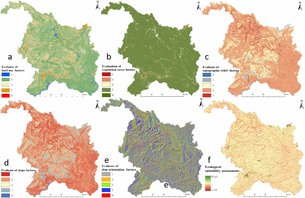 图5景观生态适宜性单因子与综合评价结果