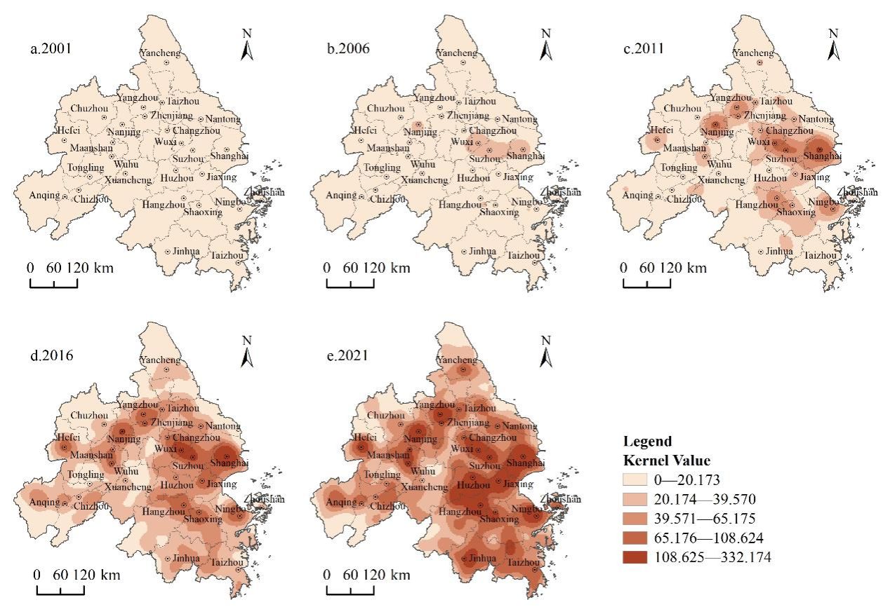 Fig 2. Kernel density map of high-level Grade A tourist attractions in the YRD city cluster