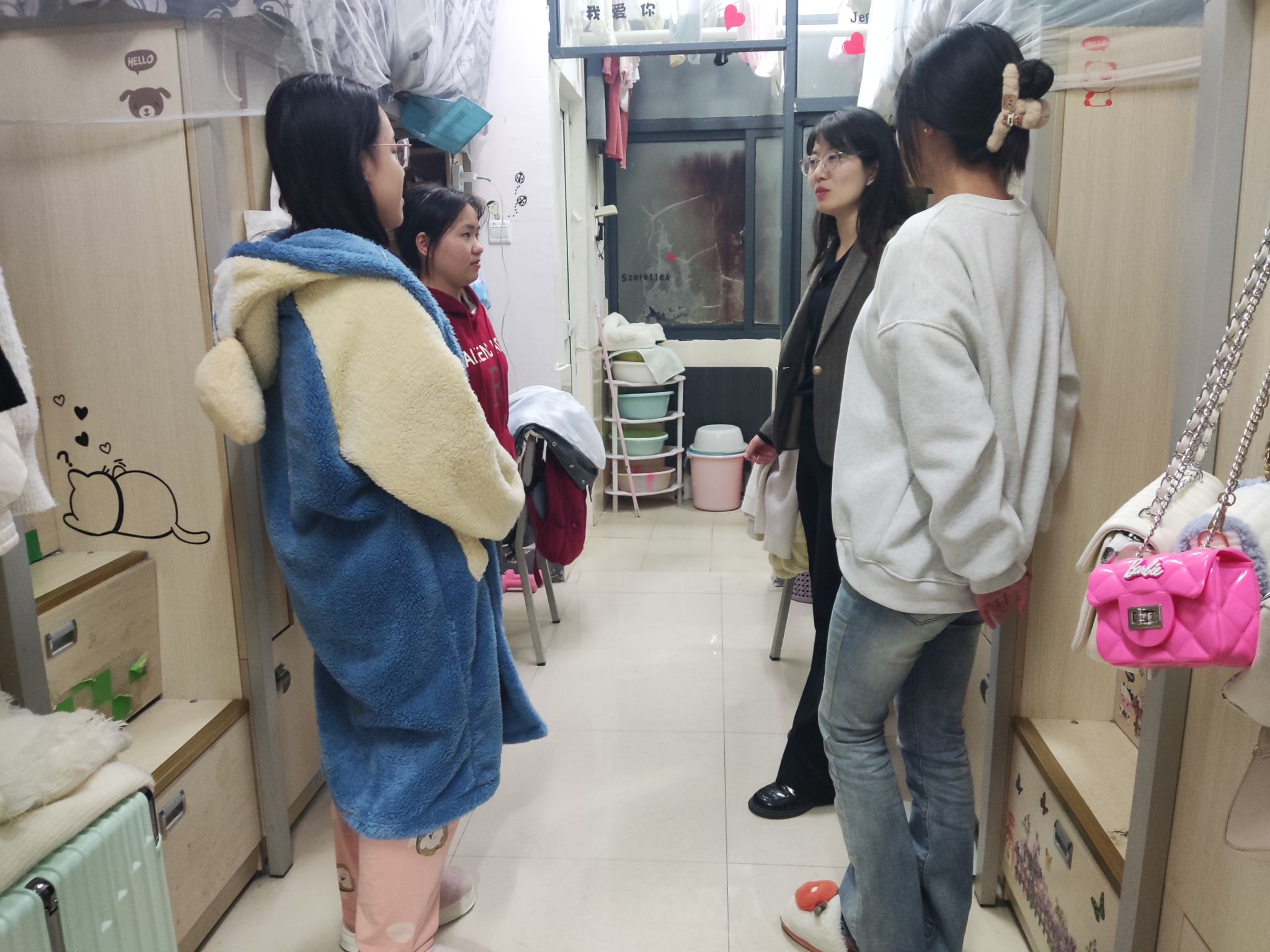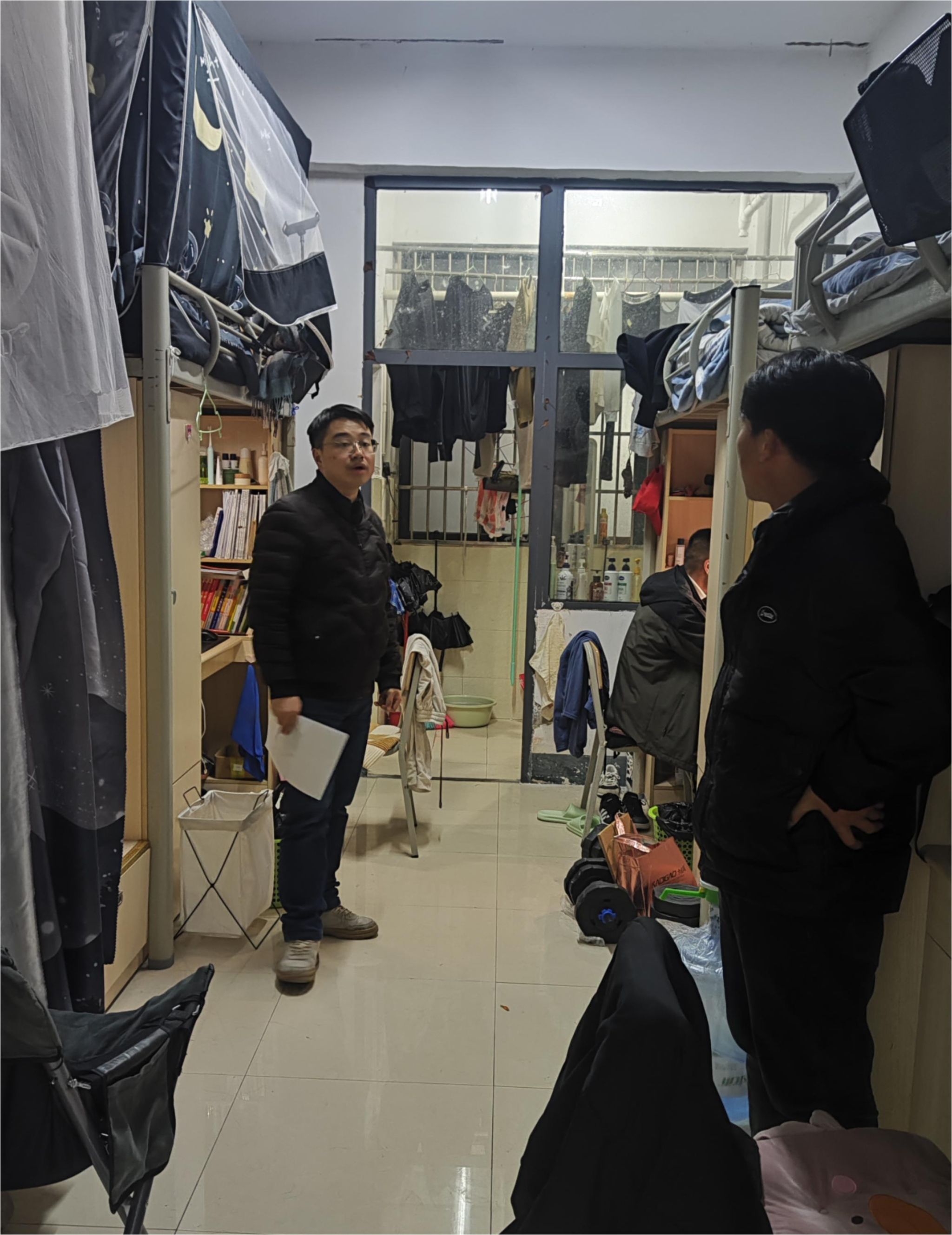 2023年12月12-21日晚,2026世界杯指定网站开展期末常规走寝活动,活动由公司党委副书记郭锐牵头,公司辅导员组成走寝团,分批次深入到慎思书院3栋、博学书院8栋、笃行书院18栋等公司员工寝室看望同学们。