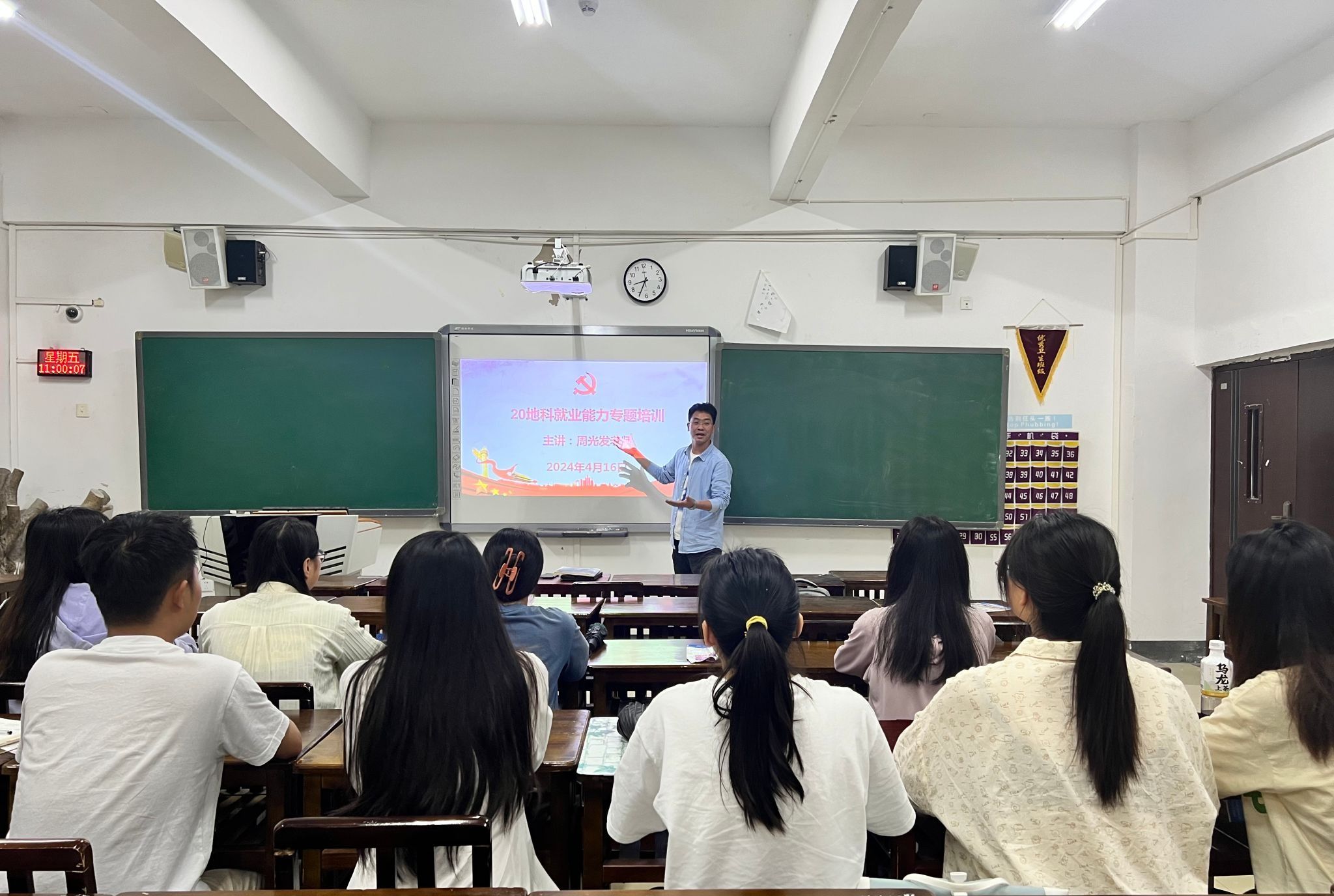 周光发老师从分析用人单位的招聘需求入手,详细阐述现阶段的就业形势、就业难点等问题。随后,结合师范专业的特色和求职要求,从简历制作、面试技巧、试讲技能、应试心态等方面进行细致分析和讲解。最后,和同学们分享了自身的成长经历,希望同学们结合自身实际,树立正确就业观念,合理选择,早日找到心仪的工作。
