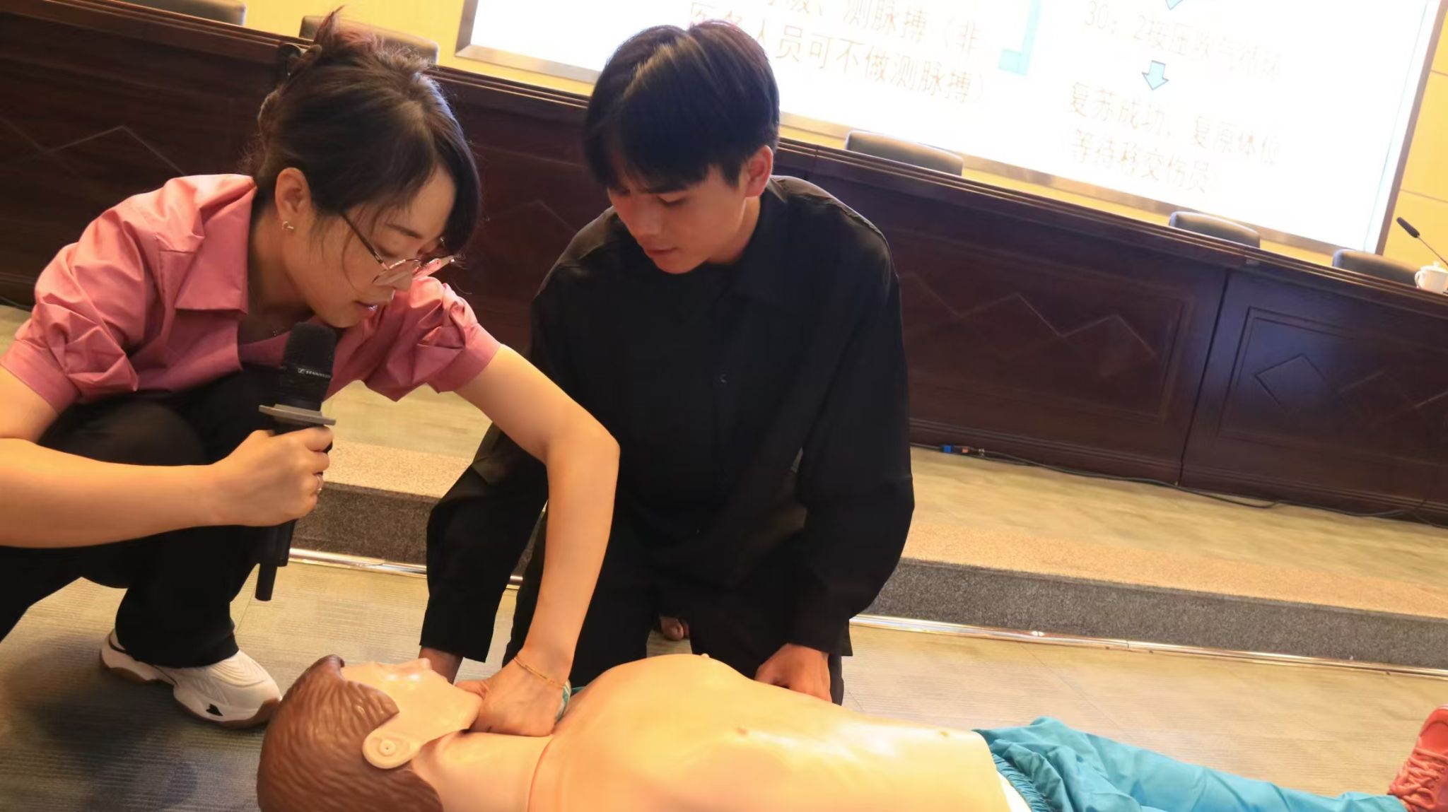 此外,两位医生还现场手把手的指导同学们进行急救操作练习,使同学们对应急救护有了更加直观的认识和了解。