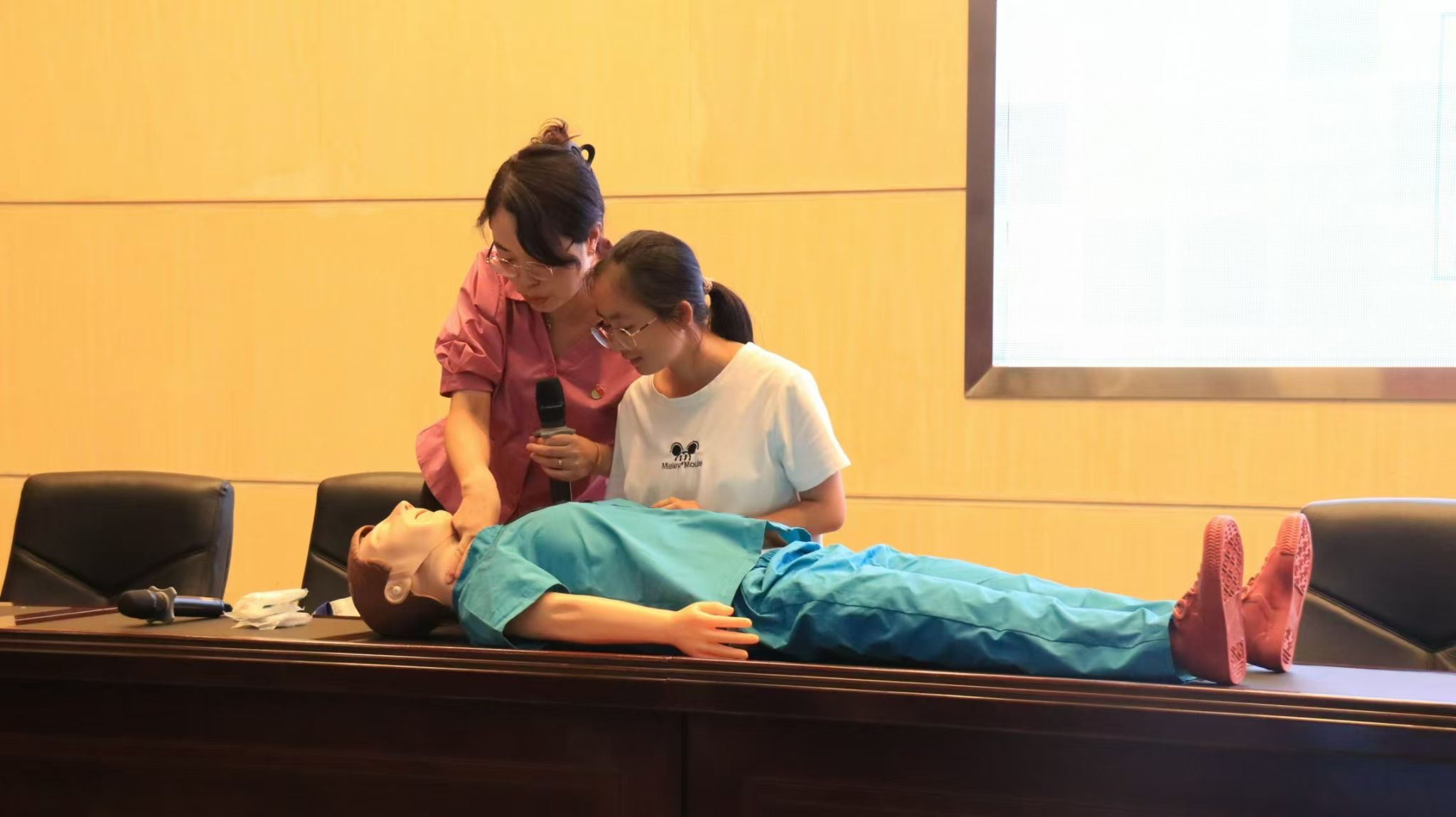 两位医生以“党建引领来护航 医教协同共发展”为主题,从身边实际案例出发,对心搏骤停的概念和表现、患者意识和心跳呼吸判断及心肺复苏胸外按压要点、人工呼吸方法和自动体外除颤仪(AED)的使用等进行了详细讲解。