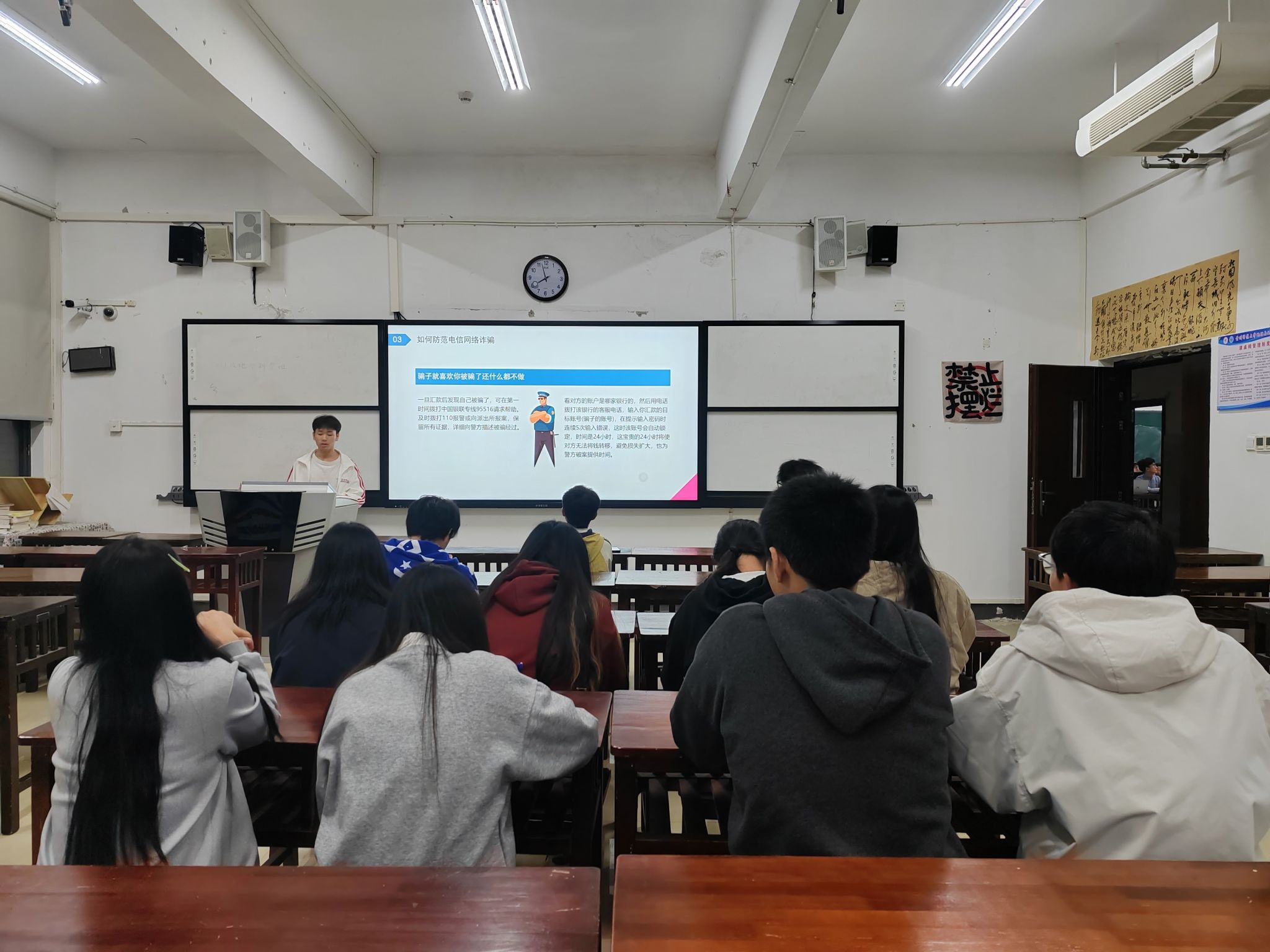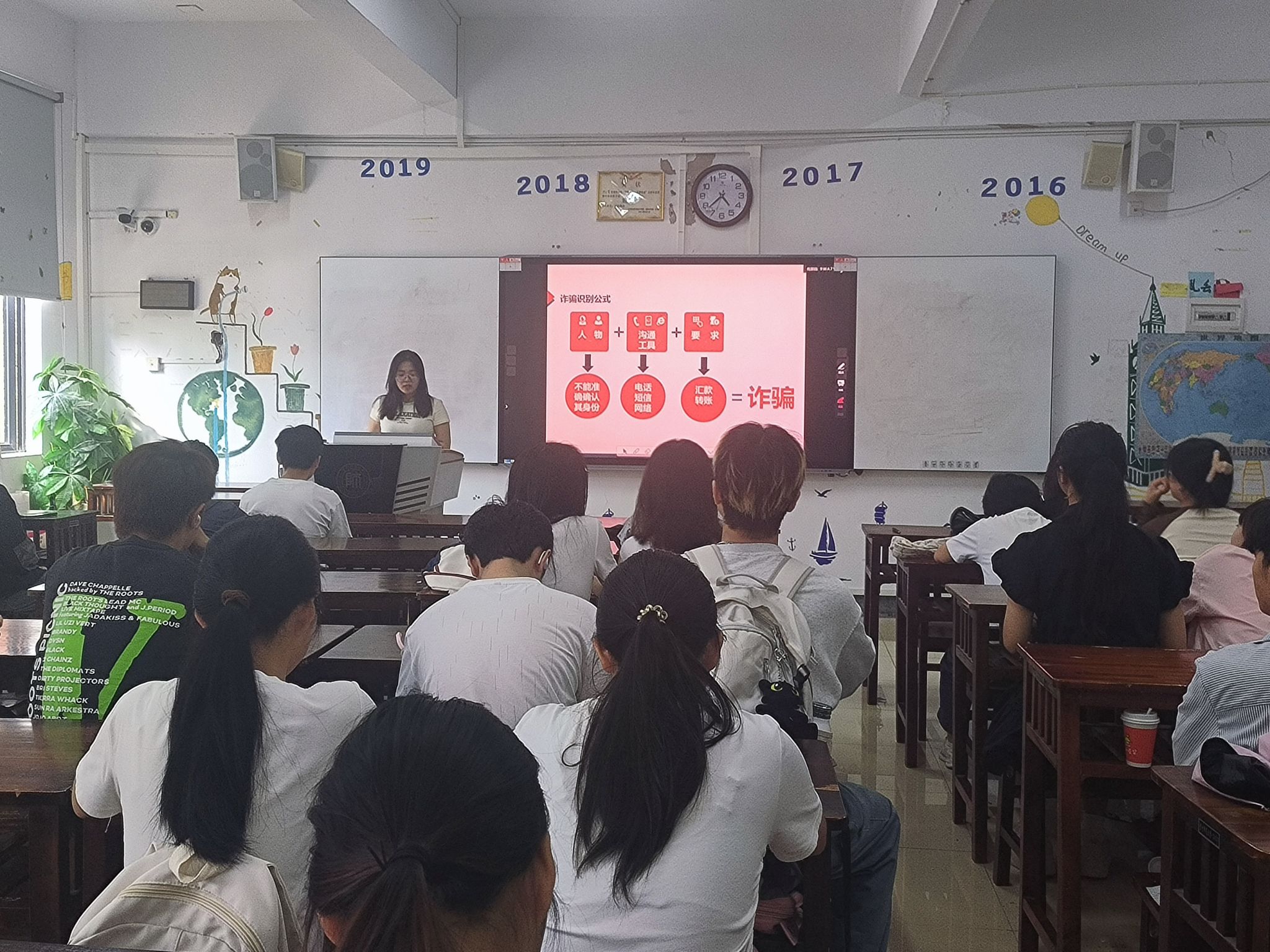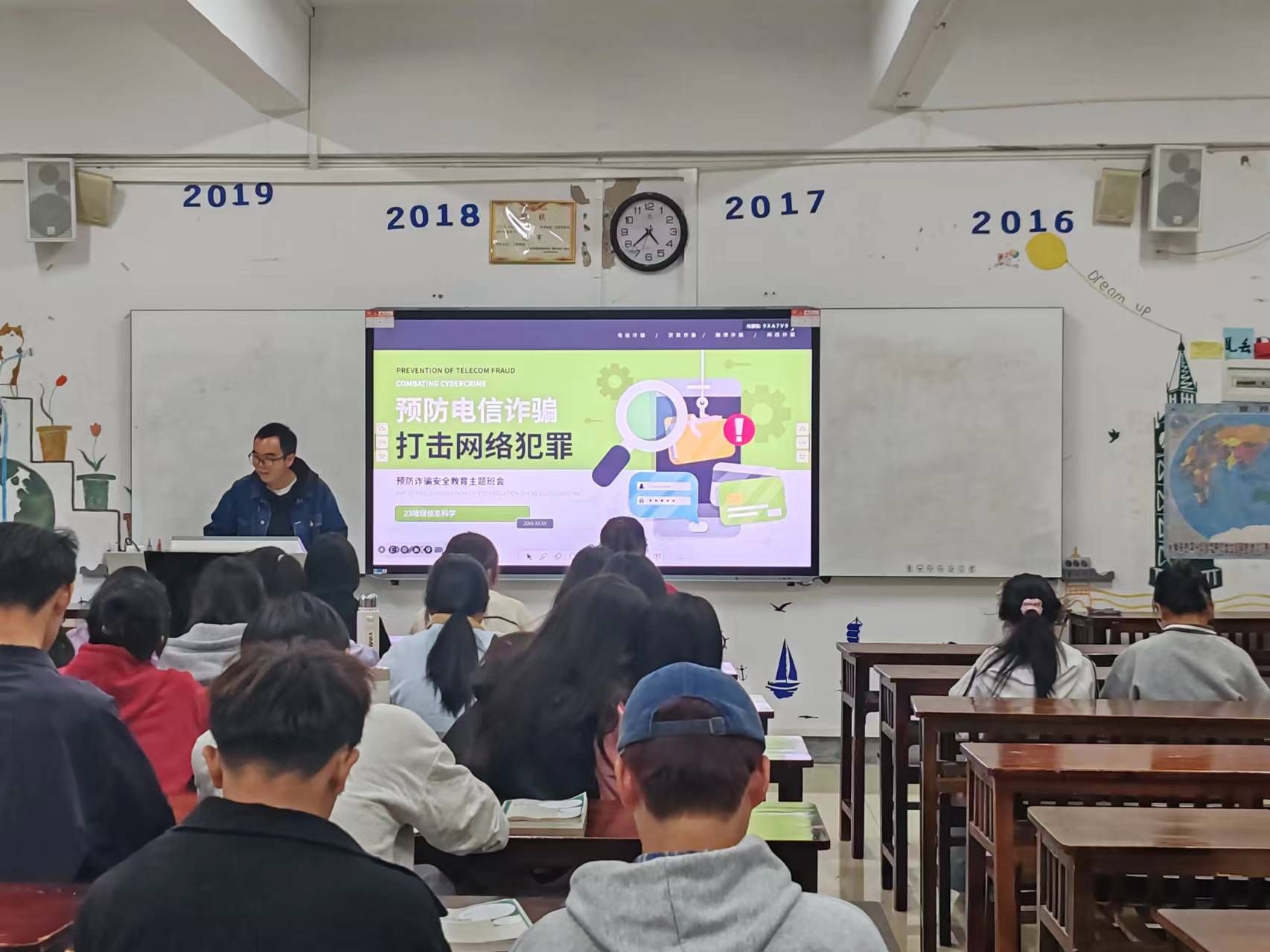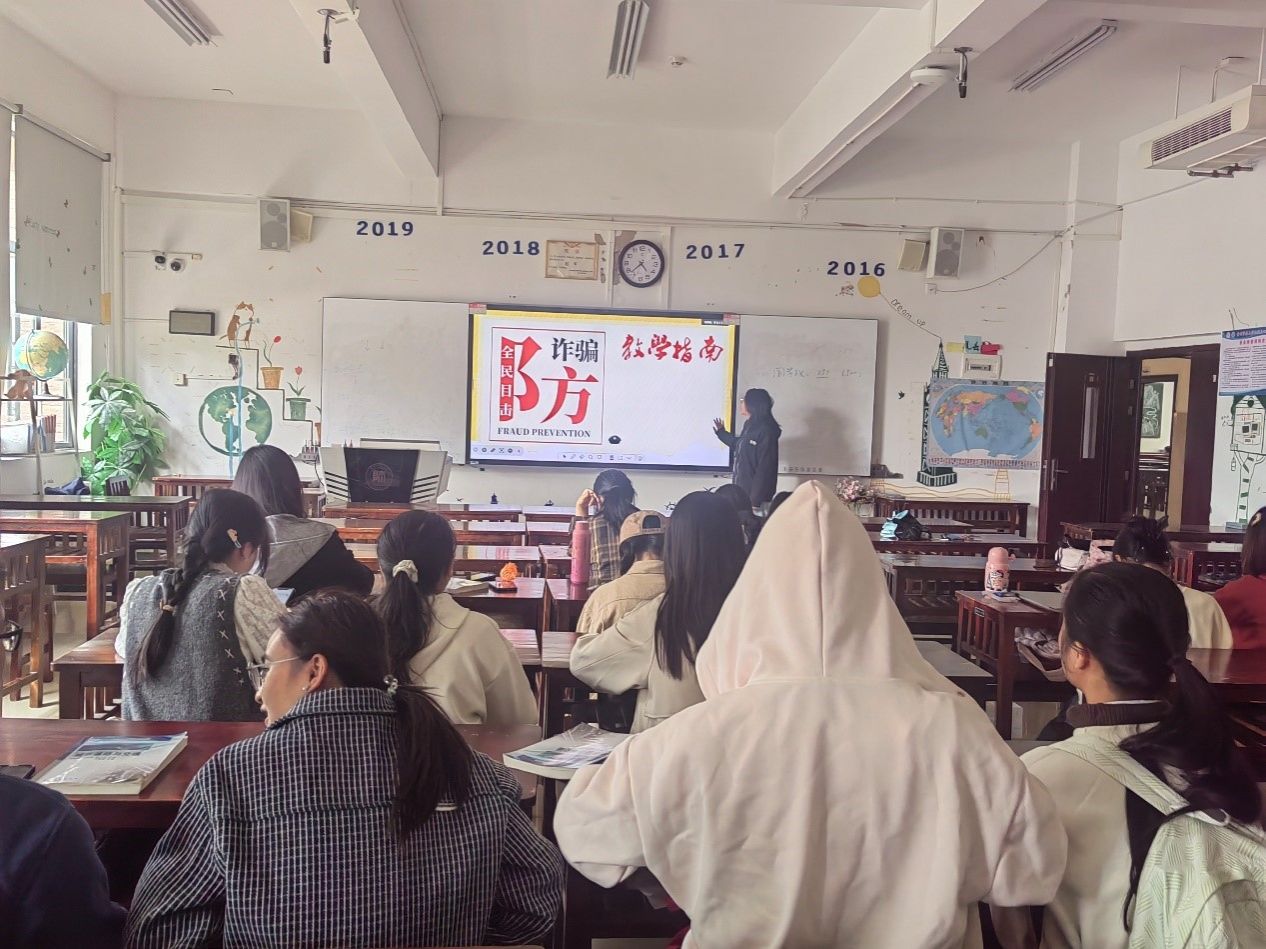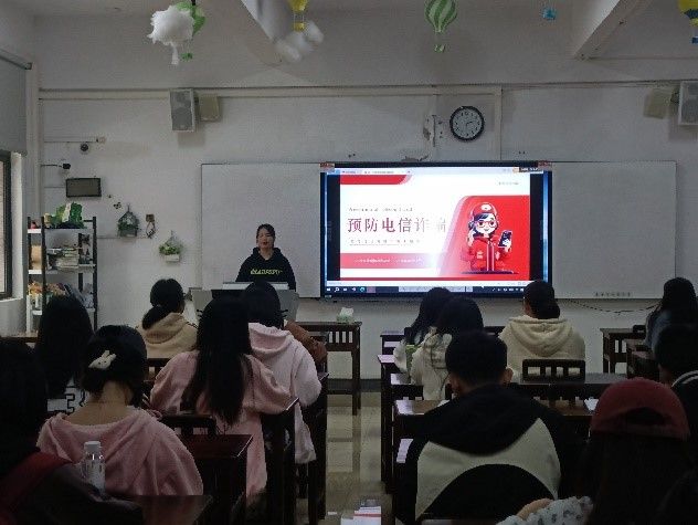在各班辅导员组织下,各班通过主题班会向同学们阐释网络电信诈骗的定义,概述其手段与特点,并结合真实案例,向大家讲述电信网络诈骗的常见类型,揭示电信网络诈骗的巨大危害。引导同学们树立正确的消费观念,不轻信缴纳贷款保证金,不轻信“无担保无抵押贷款”等虚假贷款广告。希望同学们提高理性思维,将电信网络诈骗安全知识拓展到生活的方方面面,切实维护个人的财产安全。