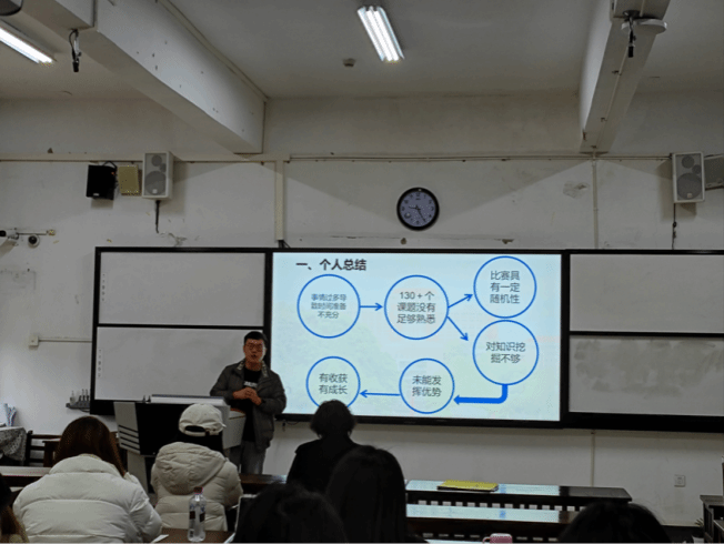 张子翔同学围绕讲课时间把控与课堂氛围营造进行总结。他认为决赛所抽课题《大气的组成与人类活动》内容虽相对简单,但因前期对课题整体结构把握不全,准备内容不足,未能充分利用15分钟的展示时间。作为非师范背景员工,他深刻体会到教学能力的提升离不开系统的专业积累,此次比赛也让他在课堂互动设计与临场应变方面获得了宝贵锻炼。
